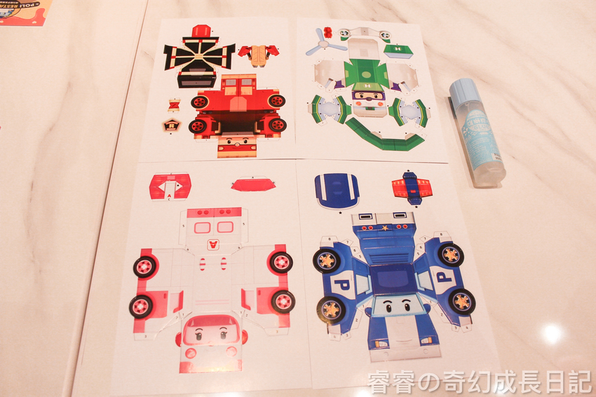 入座之後,服務生姊姊立刻送上波力車車的摺紙和膠水,讓我們在等待餐點的時候不無聊