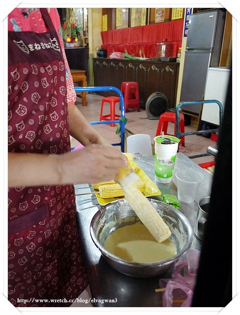 老闆娘先在玉米上面裹一層漿粉 然後去油炸