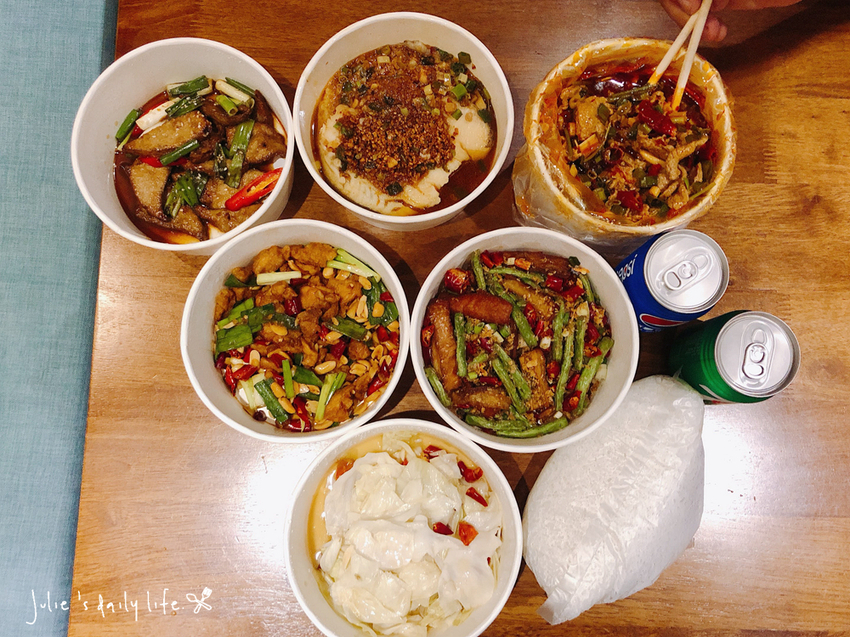 豆酥鱈魚、水煮牛、香煎豬肝、四季肥腸、宮保雞丁、醋溜高麗菜,還附上了吃不完的白飯。
