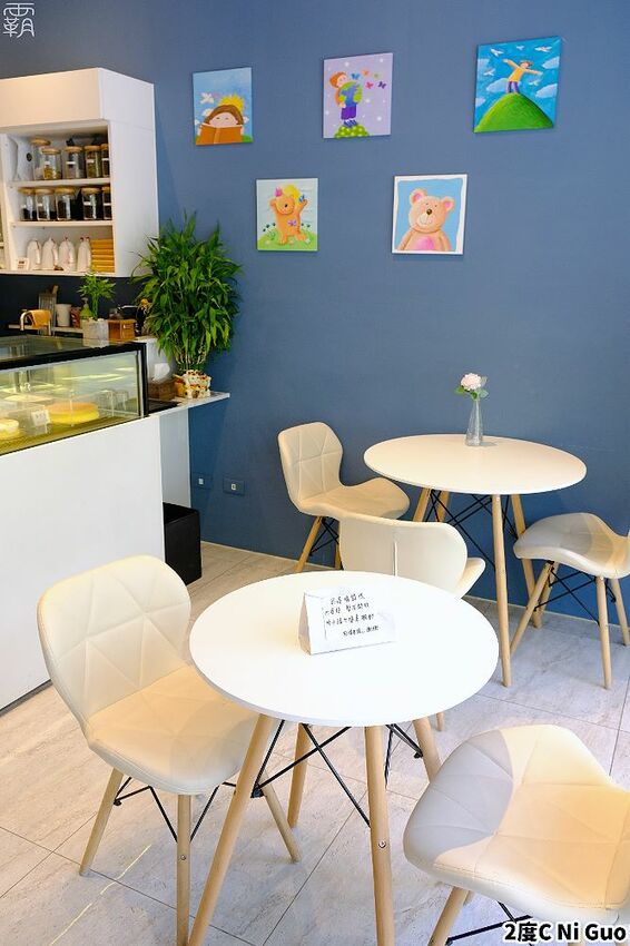 「2度C Ni Guo」公益店也是目前這三間門市裡有提供座位讓客人內用的店面,店內環境以湖水藍色系搭配白色桌椅呈現出蛋糕甜點店的典雅感。