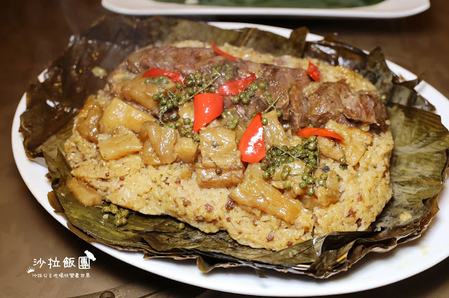 滷汁濃縮後拌入以和牛油花煉製的香濃和牛油,以及牛肉丁、蒸熟的長糯米飯,再鋪上滷製好的和牛腮及牛筋,以及爆香青花椒,包覆上清香竹葉及荷葉蒸成