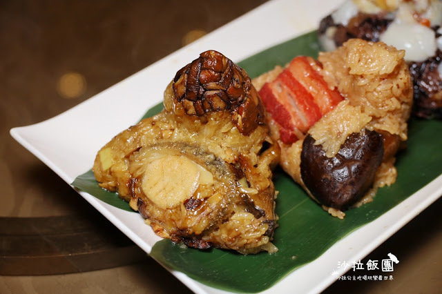 牛肝蕈鮑魚粽 法國進口牛肝蕈切丁油炸,與五花肉汁、紅蔥酥拌入糯米飯,另將牛肝蕈切絲,與洋蔥絲及杏香菇絲加入以老母雞、金華火腿及豬後腿肉熬煮八小時的港式上湯,製成牛肝蕈凍,並與杏香菇切塊、整顆南非活鮑魚,及酥炸後滷製的栗子、鹹蛋黃一同入粽製成。西材東烹的噴香滋味令人欲罷不能