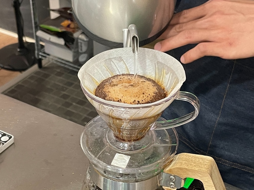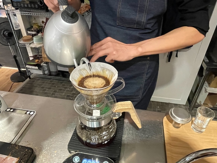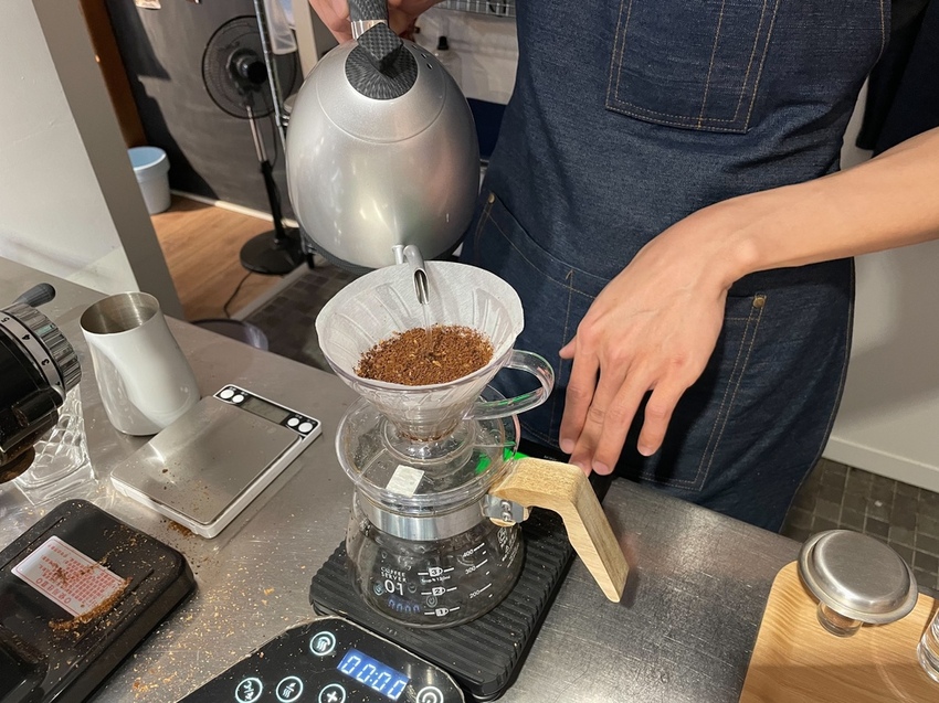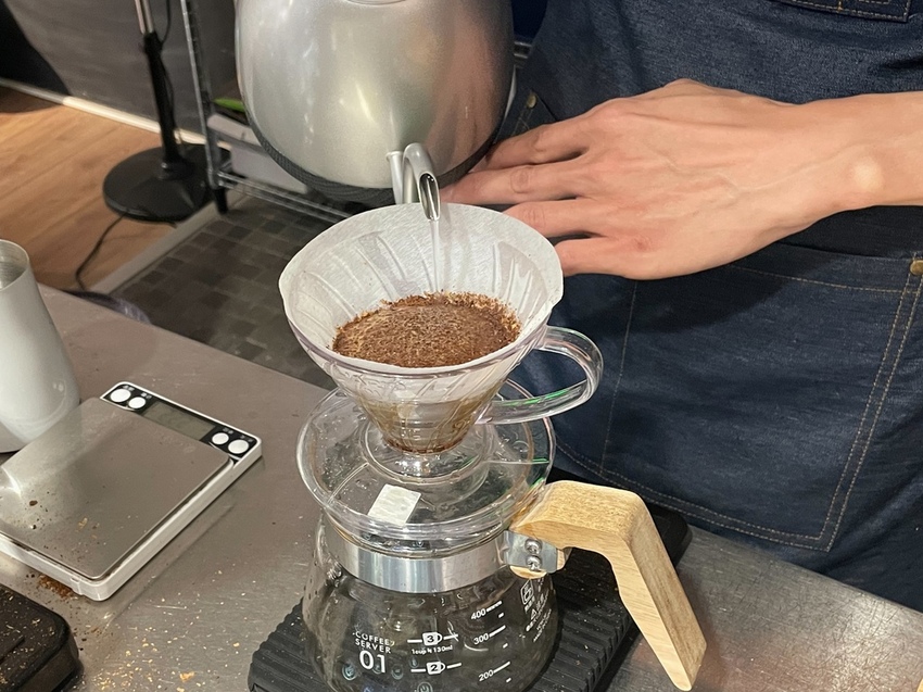 開始第二次段注水,咖啡豆非常新鮮,膨脹成一個可愛的山丘形狀