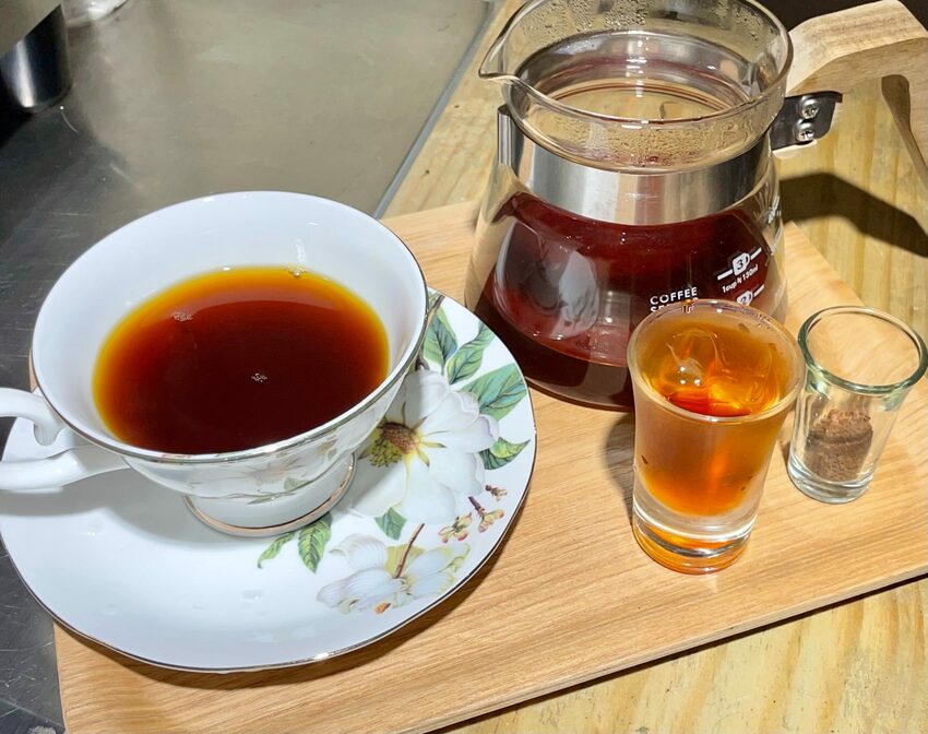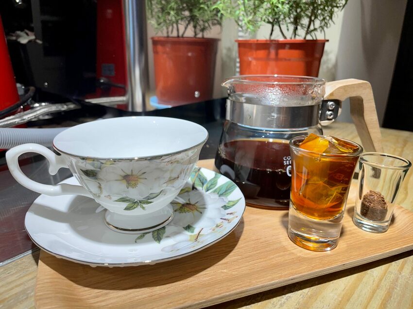 這是送上桌的SET包含剛沖好的咖啡、Shot杯中裝著冰塊可以享受到冰咖啡的滋味、研磨的細粉