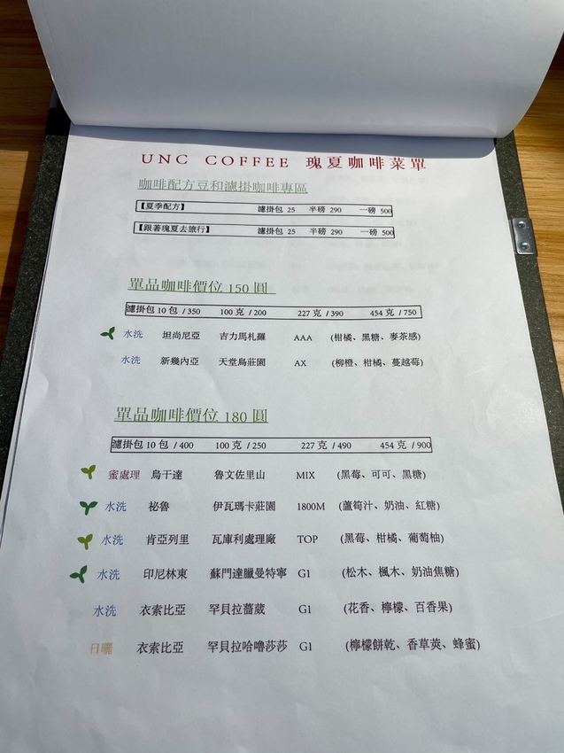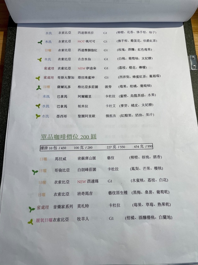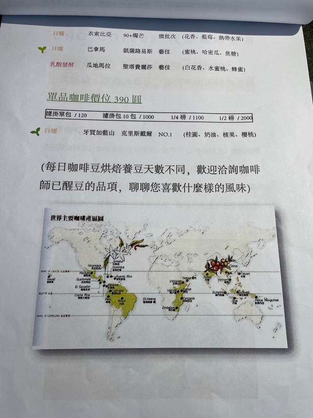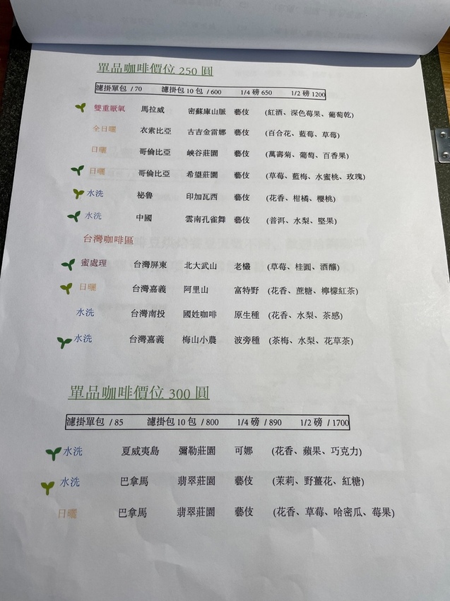 店內主打單品咖啡一共分成六種價位,從平價到高價位滿足各位咖啡饕客,而且有一些蠻特別的產區,是在其他咖啡廳找不太到的,像是坦尚尼亞、新幾內亞、中國、還有很多台灣各產區的咖啡豆