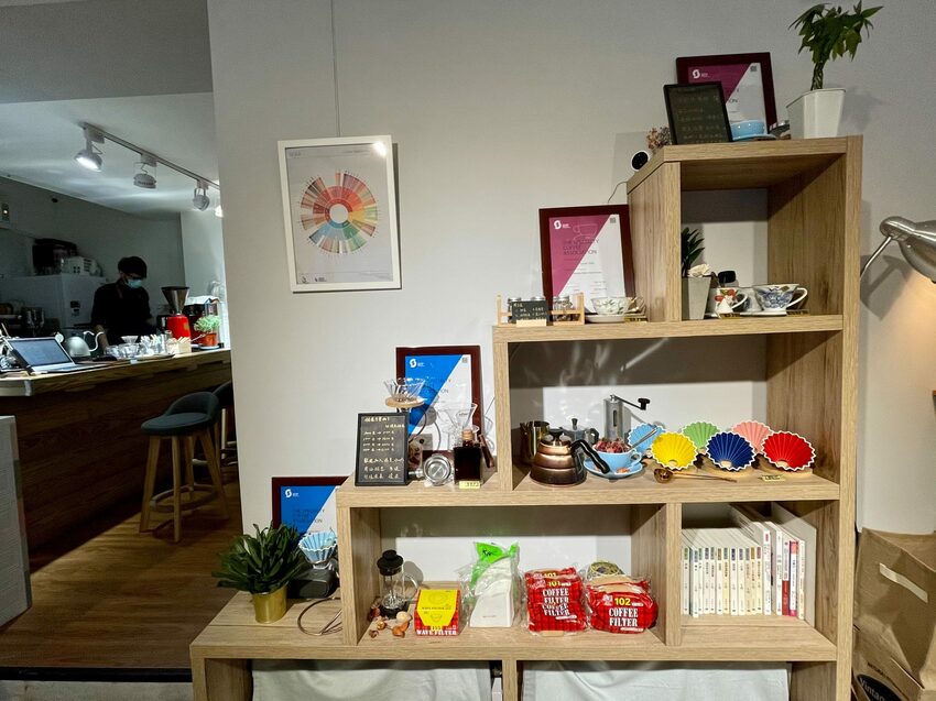 另一頭的木櫃上擺滿了各式咖啡器具及書籍,還有Jack的SCA證照