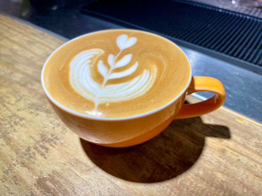 對一天要喝兩杯咖啡的我來說,喝完雙重厭氧發酵的馬拉威密蘇庫山脈藝伎等於才剛打底好,於是乎,又向Jack再加點一杯熱拿鐵,而身為過去咖啡師的我當下技癢,便問Jack可不可以讓我拉花,讓我重溫舊夢,Jack也很阿撒力的答應了