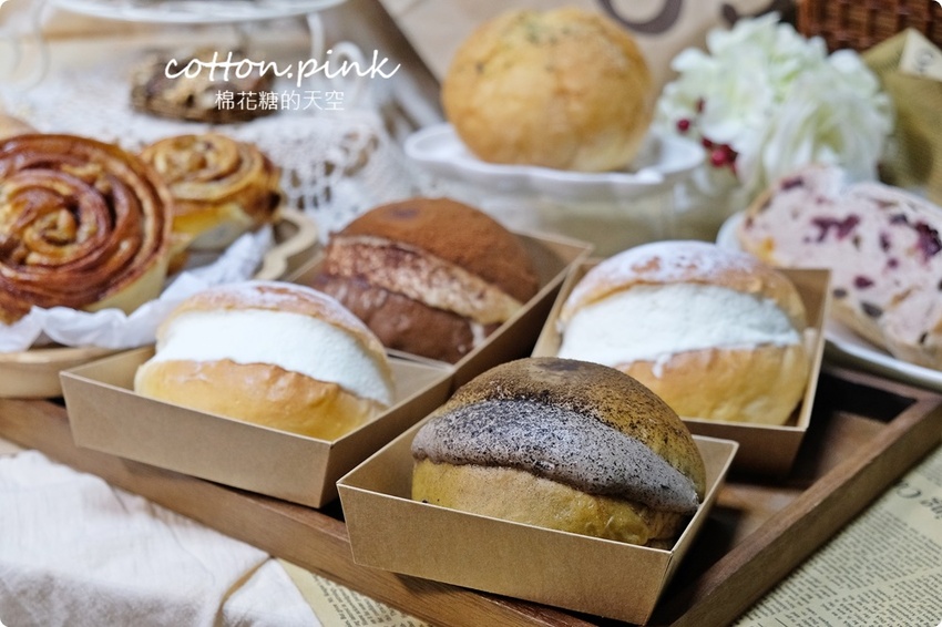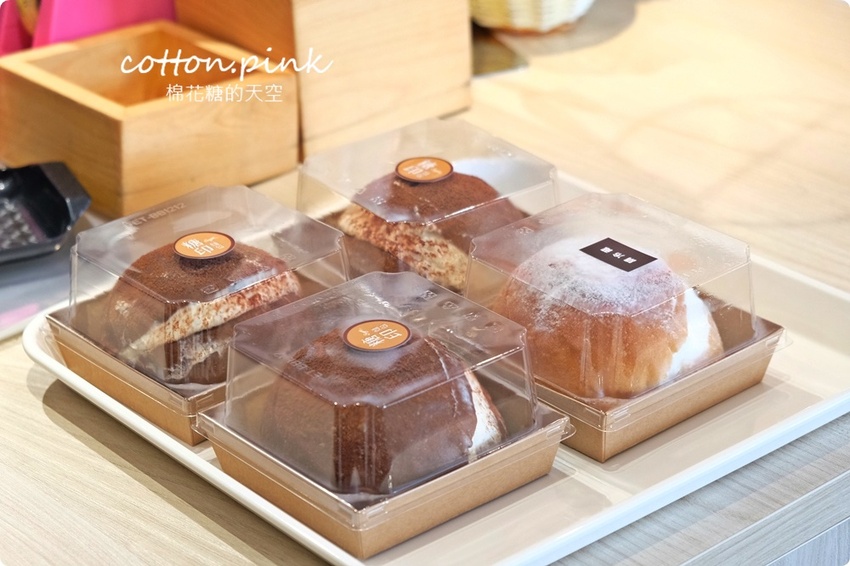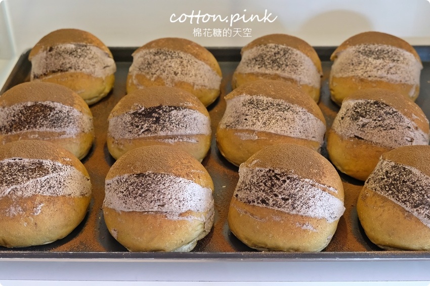 另外一個也是很受歡迎的口味就是提拉米蘇生乳包,外觀看起來就很吸引人~不只是厚厚的生乳夾層還灑上巧克力粉,看起來麵包的顏色也比較深~原來是老闆在麵糰裡面也加了可可粉唷!