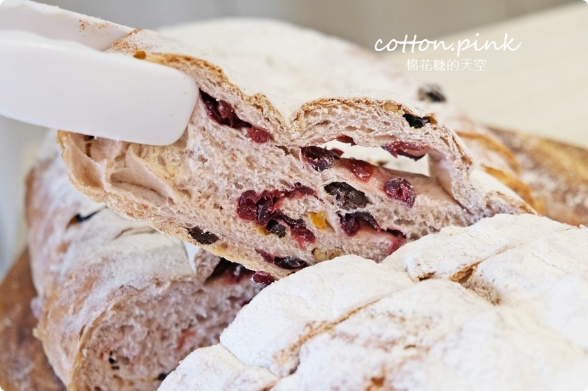 阿季去的這天現場提供的是紅酒蔓越莓口味~一切開就可以看到裡面滿滿的配料,而且麵包也是意外的軟綿~淡淡的紅酒香氣,邊咀嚼就邊瀰漫香氣在口腔,好迷人阿~