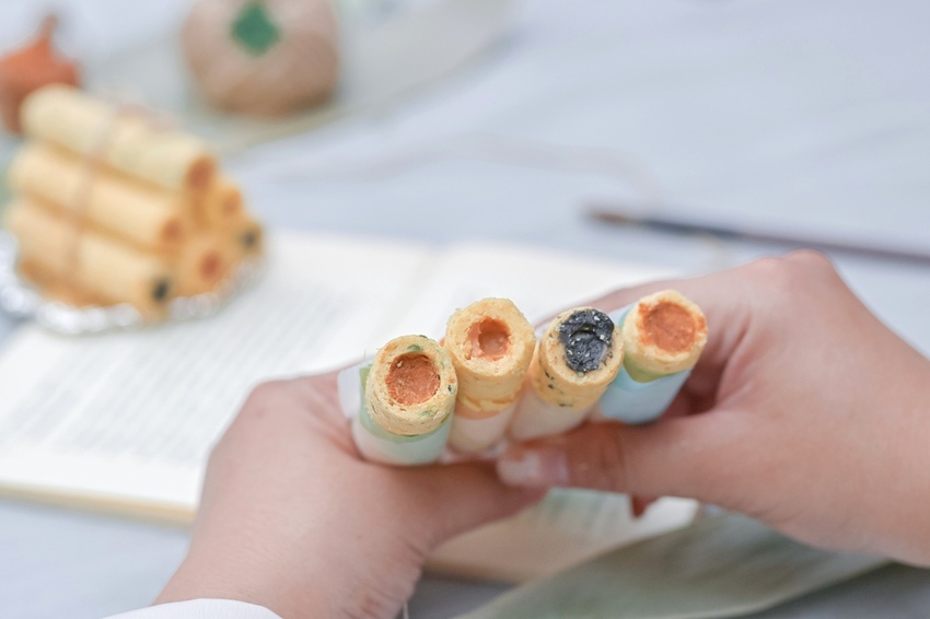 在紮實的蛋捲下,細看餅皮外觀是具有蕾絲氣孔,每一口都是酥脆飽滿的厚實喜悅,同時感受內餡帶來的層層驚喜,芝麻加熱後可是會流心的;冷凍過後的甜心蛋捲更能感受到冰心的口感。