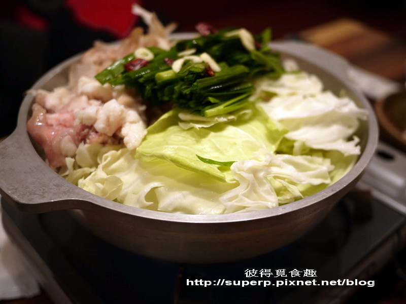 牛腸味噌鍋$600(也是在台灣少見的食物。這牛腸鍋有飛魚高湯醬油味以及味噌味可選,我們點了味噌。裡面的料有牛腸,韭菜,高麗菜,柴魚。湯頭鮮美,果然味噌鍋隨便煮都好吃,推!我們之後還追加了一份蔬菜下去放,還要加價$170)