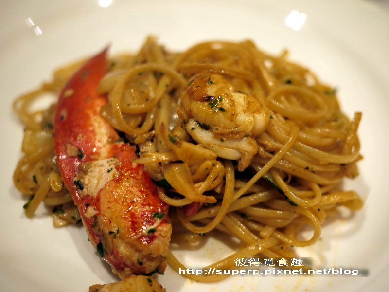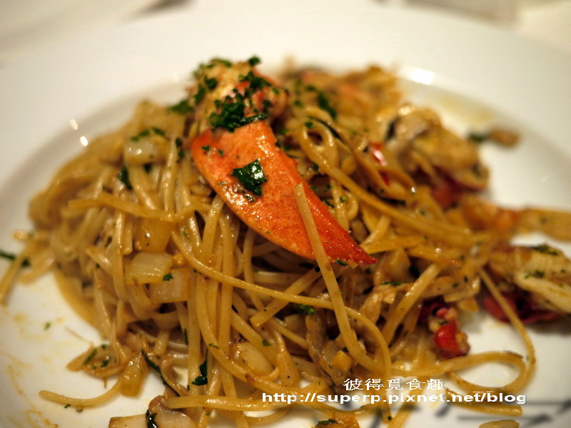 龍蝦義大利麵(也不清楚價格,龍蝦這種東西是時價。裡面一堆龍蝦肉,上面還擺了一支去殼的大螯,非常豪邁,吃起來Q彈可口。麵條煮的軟硬適中,而且吸收了龍蝦的味道,鮮美又清爽,好吃到不行!我們點了兩盤,特推!)