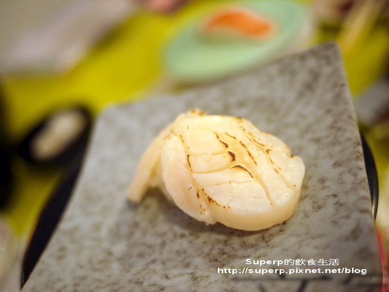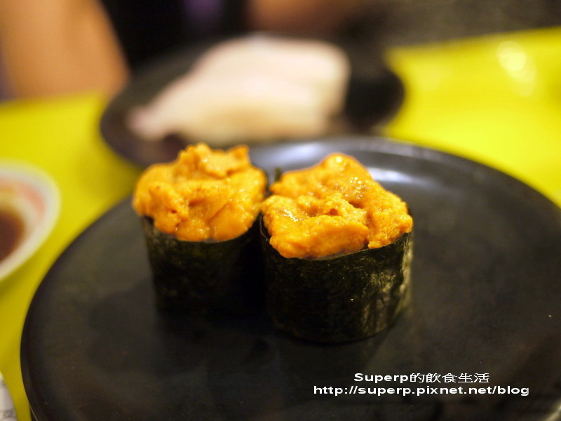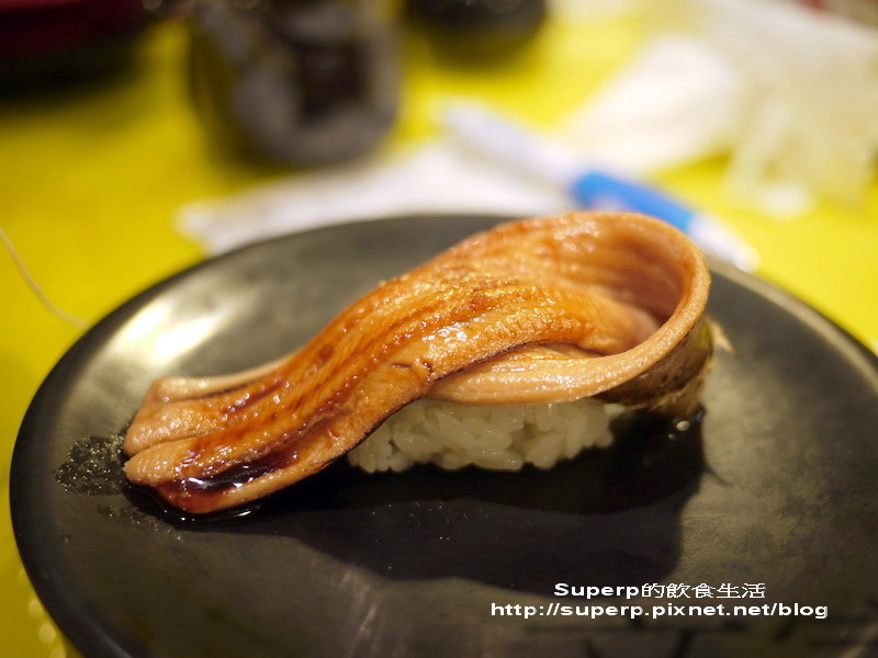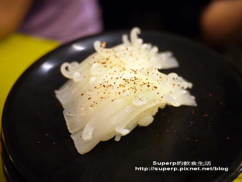 透抽$120(瞧瞧那刀工,這是一般迴轉壽司做不出來的透抽壽司,賣相極佳。上面撒的據說是乾燥後的海膽粉,是特別要求才會撒的,添增了不同的風味,大推!)