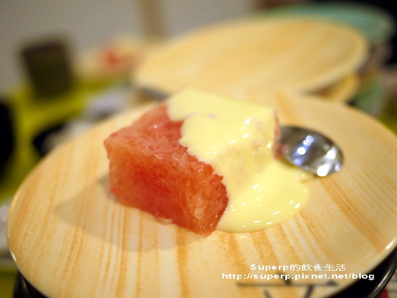 葡萄柚凍$40(這是高玉的照片甜點,沒想到小高玉也有。真材實料的葡萄柚處理成凍狀,搭配蛋黃醬。如果單吃葡萄柚凍會有的苦,但搭配蛋黃醬的甜就非常讚,大推!)