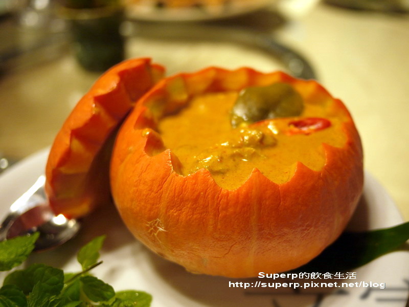 咖哩南瓜牛肉$380(咖哩牛肉非常香濃可口,香料層次相當的豐富,是個相當高明的咖哩,配飯風味絕佳!這南瓜不只是當容器美觀而已,還可以真的吃掉。咖哩醬已經滲入了南瓜,所以南瓜本身也相當的好吃,特推!)