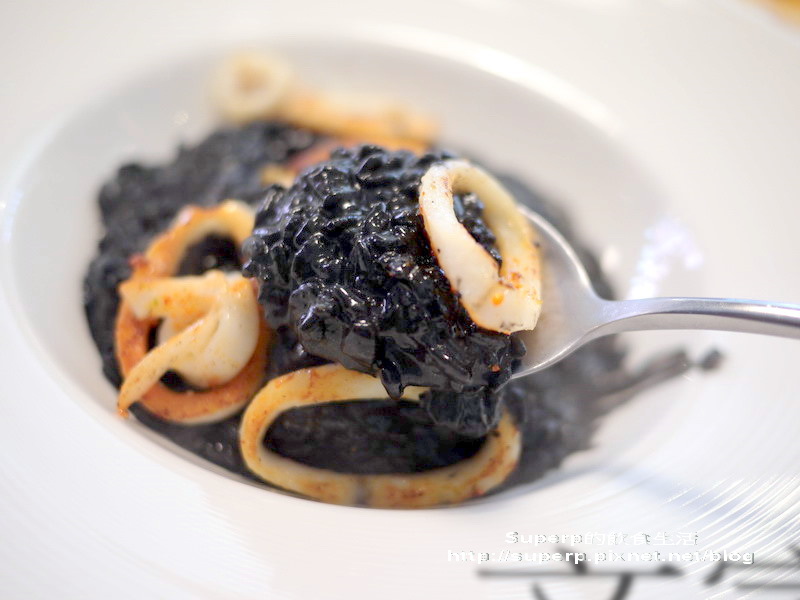 黑米墨魚燉飯$300(是店內的招牌菜。使用了黑米和墨汁,所以黑上加黑,而且充滿著海鮮風味,米的口感也棒,非常讚,大推!不過真的只能跟很熟的人去,因為吃的時候滿嘴都會黑掉)