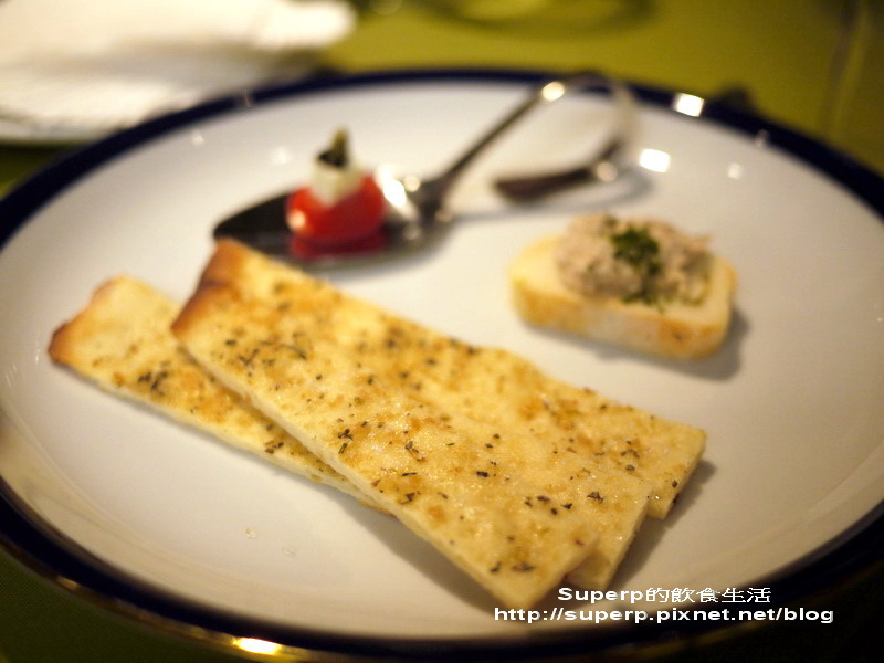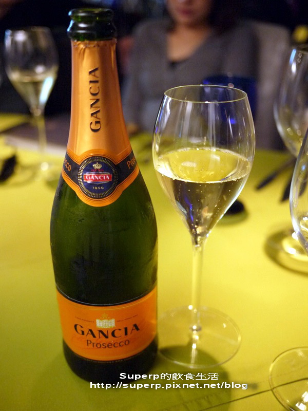 開胃點佐Gancia Prosecco崗夏 波西可 氣泡酒(開胃點有番茄配乳酪,還有香料烤餅,以及麵包片搭配記得是魚類餡料的東西,沒有拿到菜名所有我有點忘記了。擺盤美觀,而且都很可口。烤餅這次還保留著脆度,沒有像之前那樣放太久而潤掉。Gancia Prosecco喝起來帶著微甜的蘋果香,氣泡也足,很不錯)