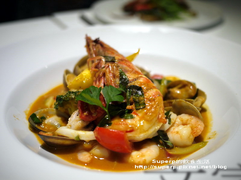 細燉薩丁尼亞島風味什錦海鮮盤$620(湯汁充滿了海鮮的精華,沾麵包絕佳。海鮮頗嫩,中間那隻特大的蝦子有被事先去殼了,吃起來爽度很高,推!)