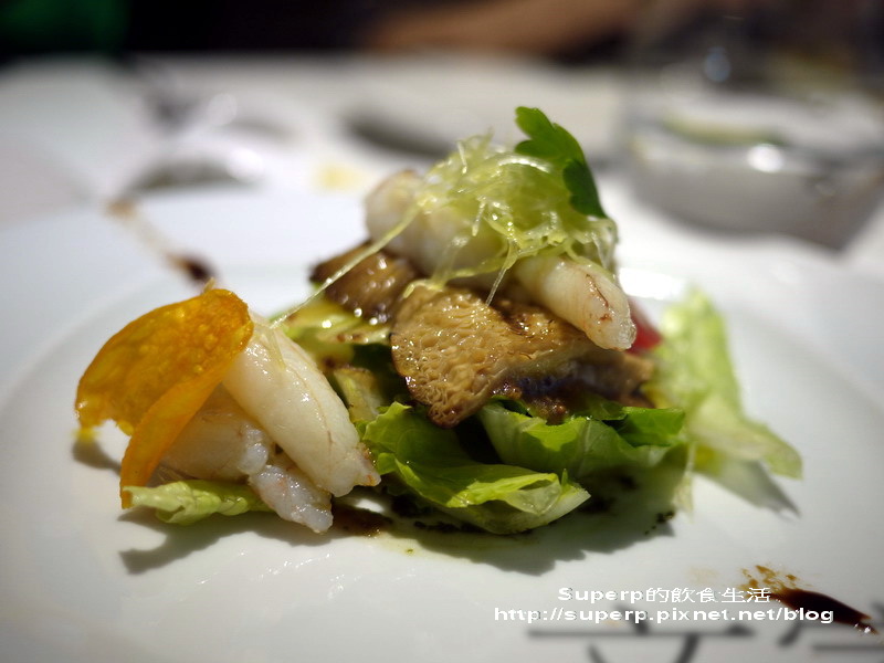 螃蟹沙拉配碳烤鮑魚菇(酒醋醬搭配蟹肉以及菇類,頗優,推)