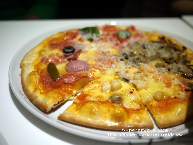 四季披薩$400(這有辣味沙拉米,瑪格莉塔蕃茄,什錦海鮮,碳烤蘑菇四種口味。餅皮又薄又脆,夠水準,推!)