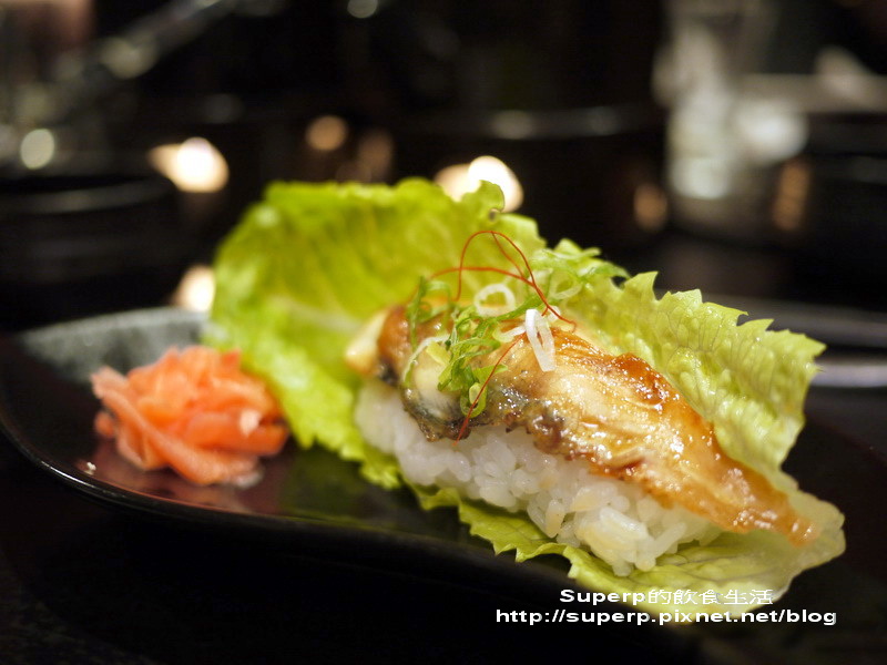 炙燒鰻魚手捲(鰻魚壽司外包著蘿曼生菜,還不錯)