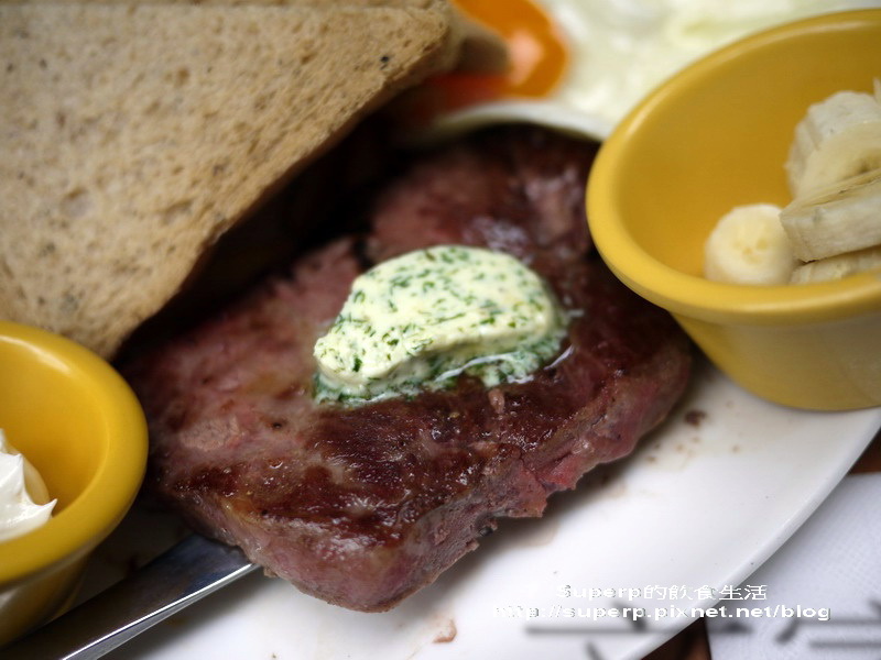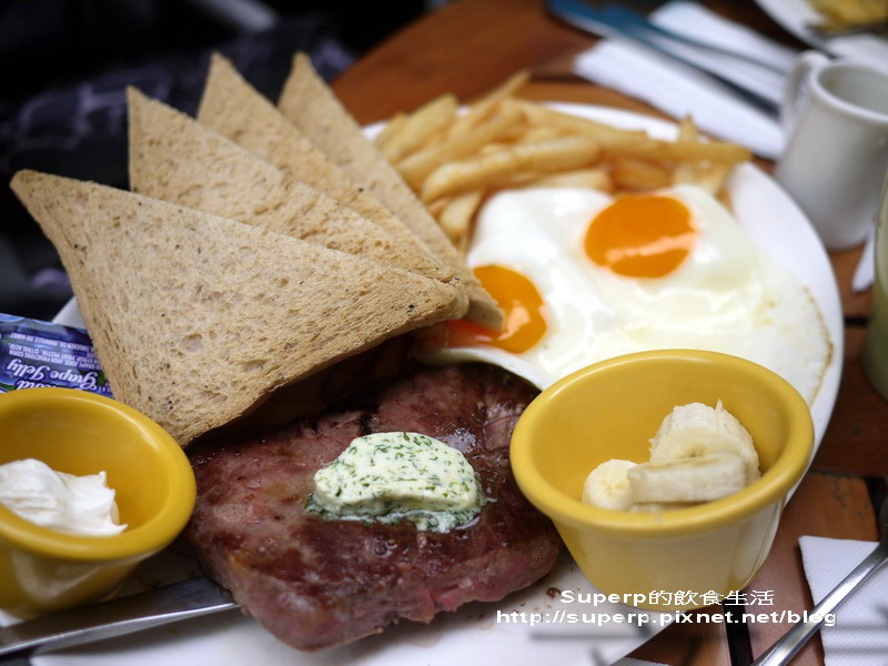香煎牛排早餐$360(有一片牛排,太陽雙蛋,土司,香蕉,以及薯條。基本上這是個我絕不會點的餐,因為在家很容易做。我還恥笑朋友說,明明牛排和蛋在家就常煎,何必來這裡吃,而且還可以用比較好的牛肉)