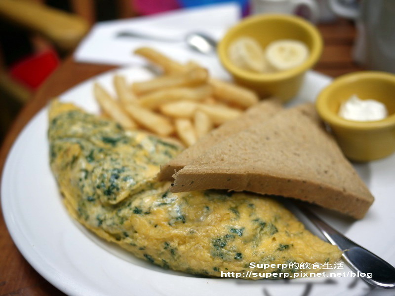 美式煎餅早餐$220(就是兩大片的鬆餅,薯條,兩條香腸,炒蛋,以及香蕉。鬆餅還好,炒蛋倒是很不錯,不過也不是我會想點的餐)