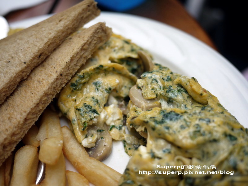 希臘蛋捲$250(半熟的蛋捲裡面有清爽的波菜,帶來口感的蘑菇,以及濃厚的費達起士,一整個是我喜歡的組合。蛋捲的味道跟口感都相當的豐富。推!)