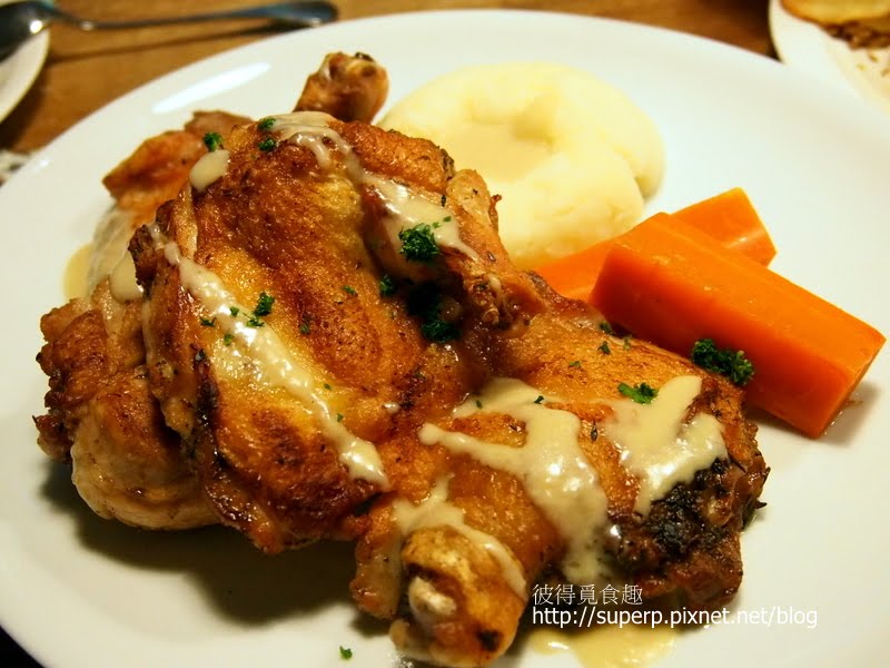 義式烤全雞$600(雖然是說全雞,但其實是去骨的連背雞腿,只是份量很多。如果是半隻,就是兩個連背雞腿,但半隻就要$480了,所以還是點全雞來的划算。這烤雞外皮酥脆,肉質柔軟多汁,好吃,。其實美味的程度是推的等級,但這去骨了,吃起來很方便,因此加分變成大推!不過薯泥跟配菜就很路人等級,純裝飾用的。)