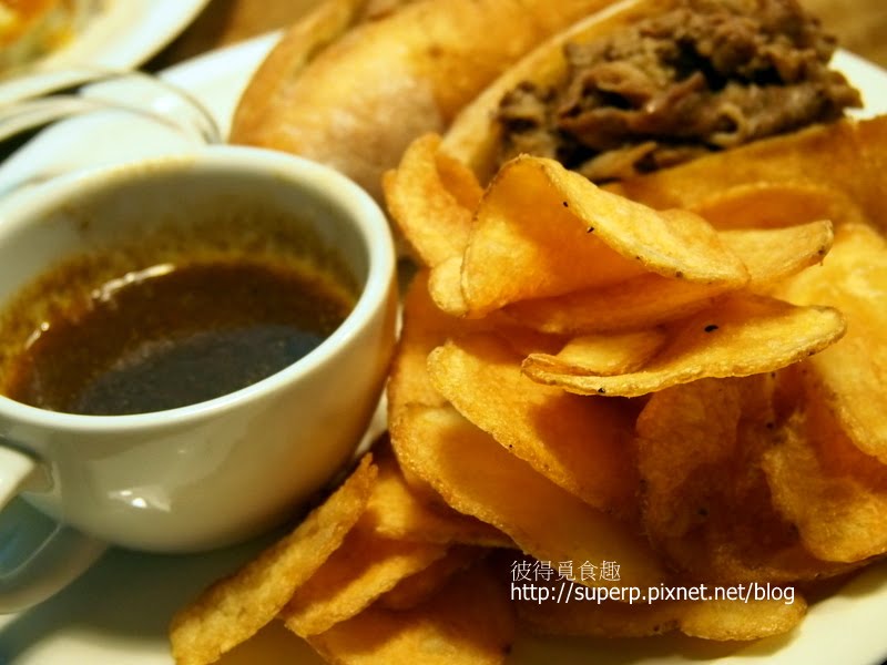 爐烤牛肉三明治$360(上次也有點這個。法國麵包裡面夾滿了牛肉薄片,沾著牛肉醬汁一起吃,很正統而且美味!而且他們的薯片又薄又硬又脆,非常好吃!大推!)
