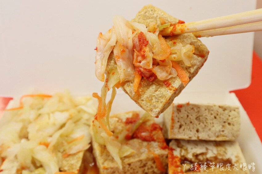 臭豆腐搭配店家新鮮自製的辣椒醬跟爽口泡菜超級過癮!我只能說,除非你真的很會吃辣,不然不要一口氣加太多辣椒啊!我覺得逢甲夜市臭豆腐的辣椒醬至少有中辣以超級帶勁!喜歡吃辣的客人可以試看看。