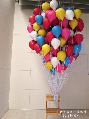 在這件為粉樂町量身打造的作品中,藝術家將無形的「力」綴以繽紛氣球,翻轉為可見的有形;飛揚的氣球就如想像力的馳騁,不受形體所限,而椅腳的缺憾也因此平衡,成就了優雅與詩意