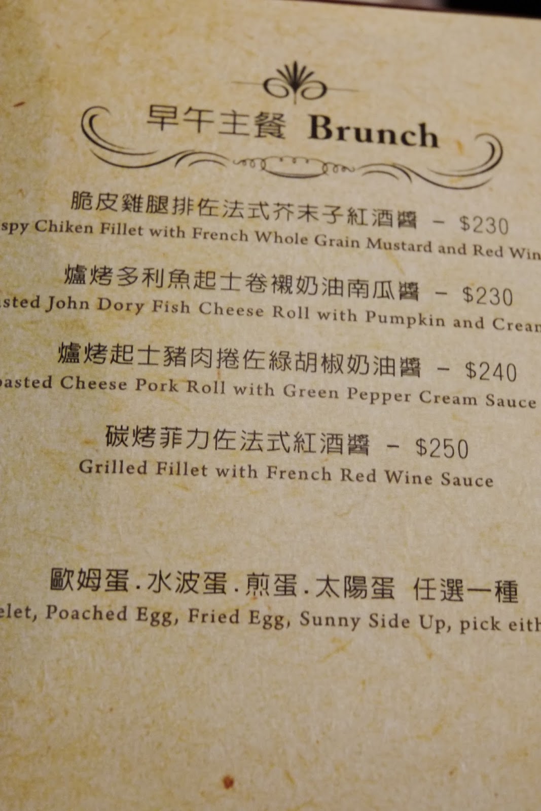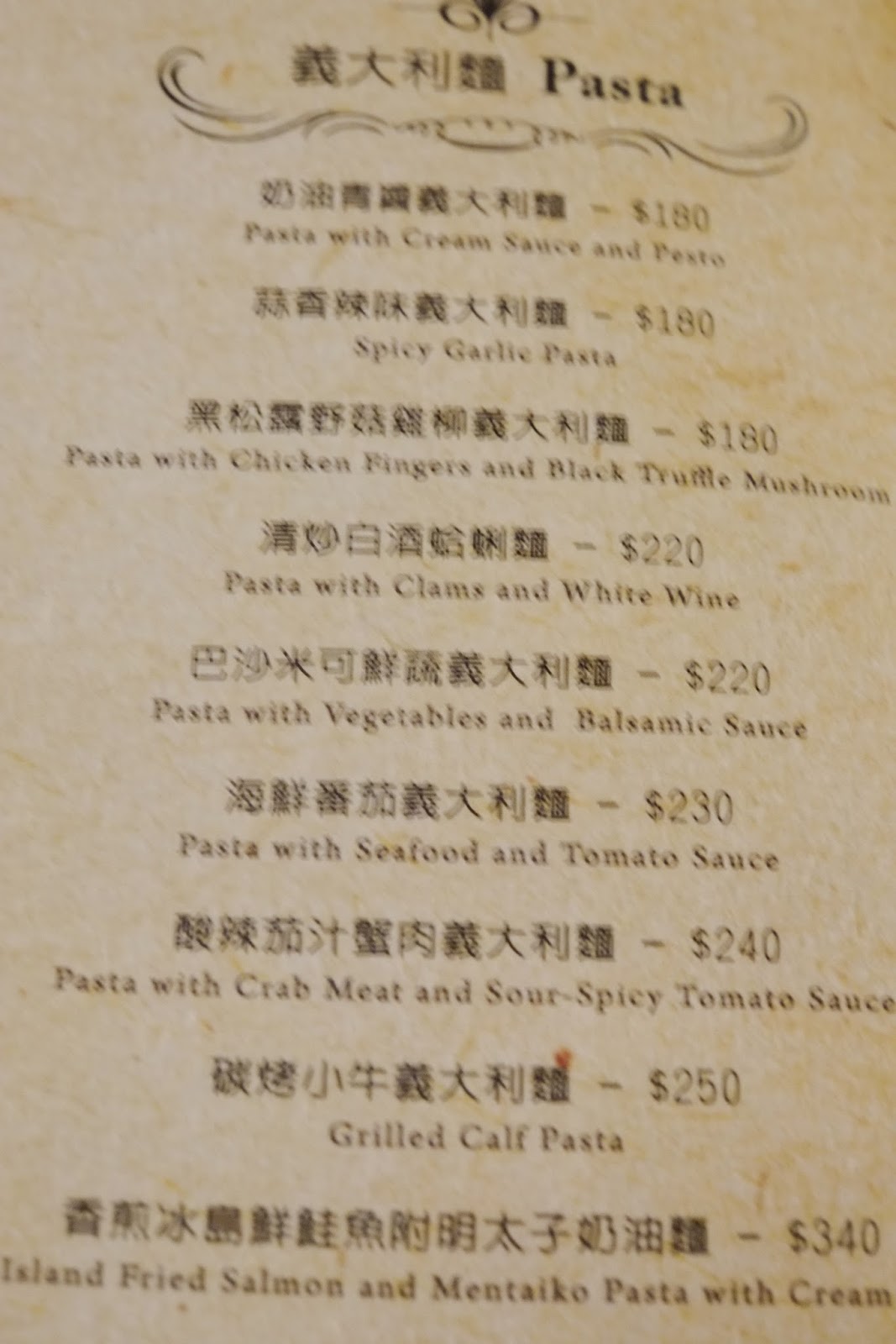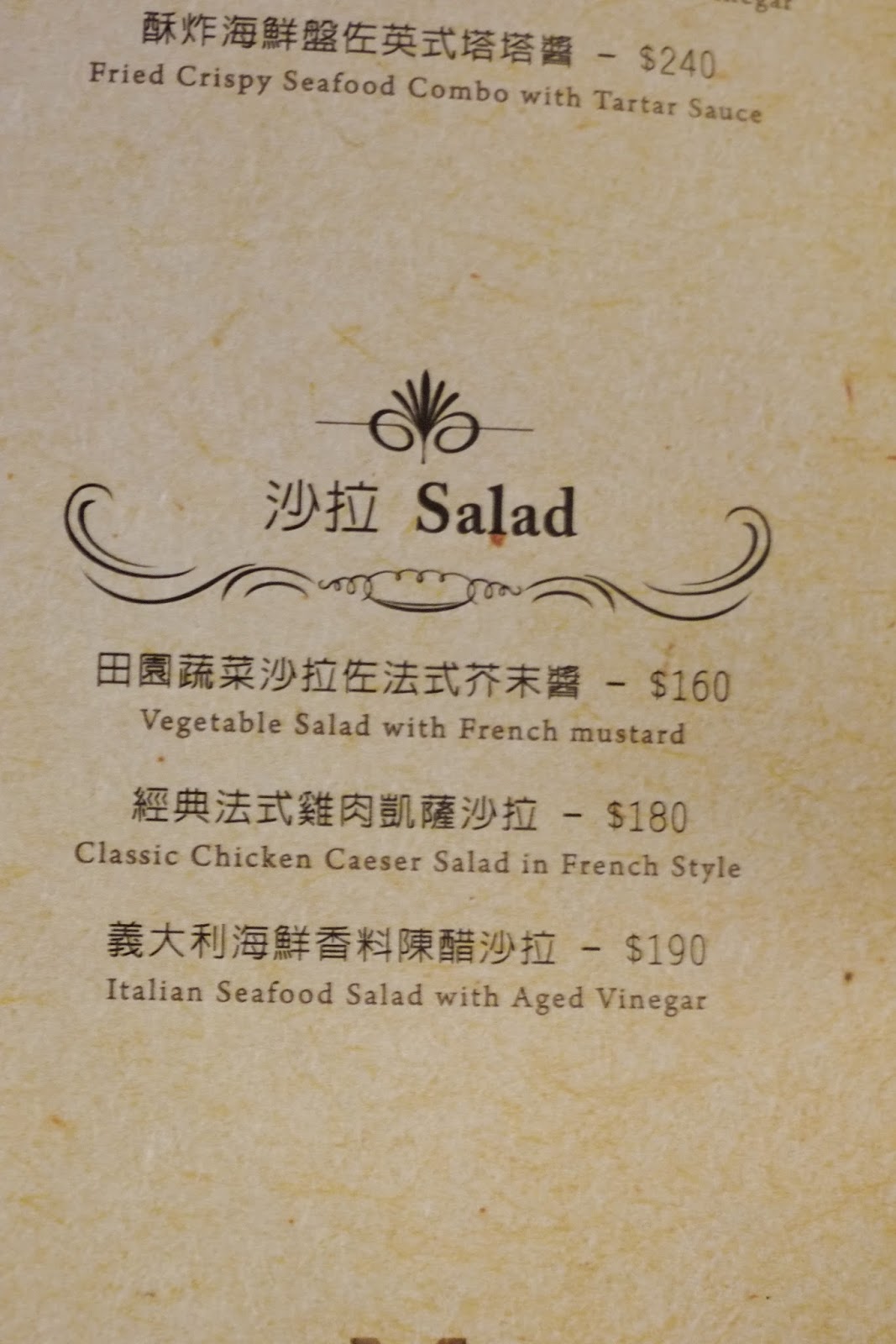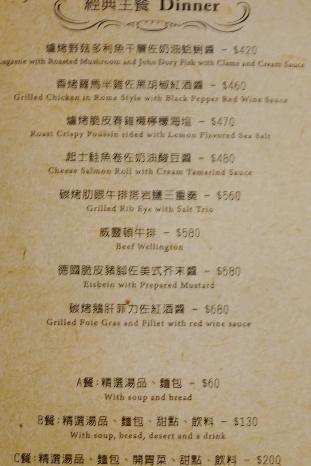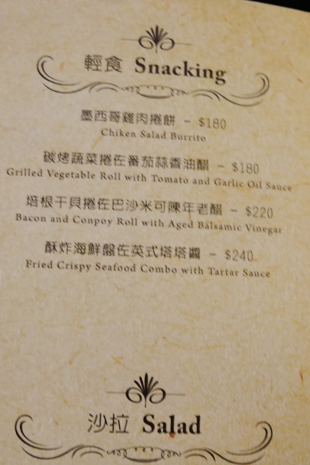 看一下菜單,蠻多元化,從早午餐,輕食,沙拉,主餐,義大利麵,燉飯等等一應俱全,價格也不會很貴,酒單部份也有一杯跟一瓶的,種類也很多,可惜我對酒不太熟。