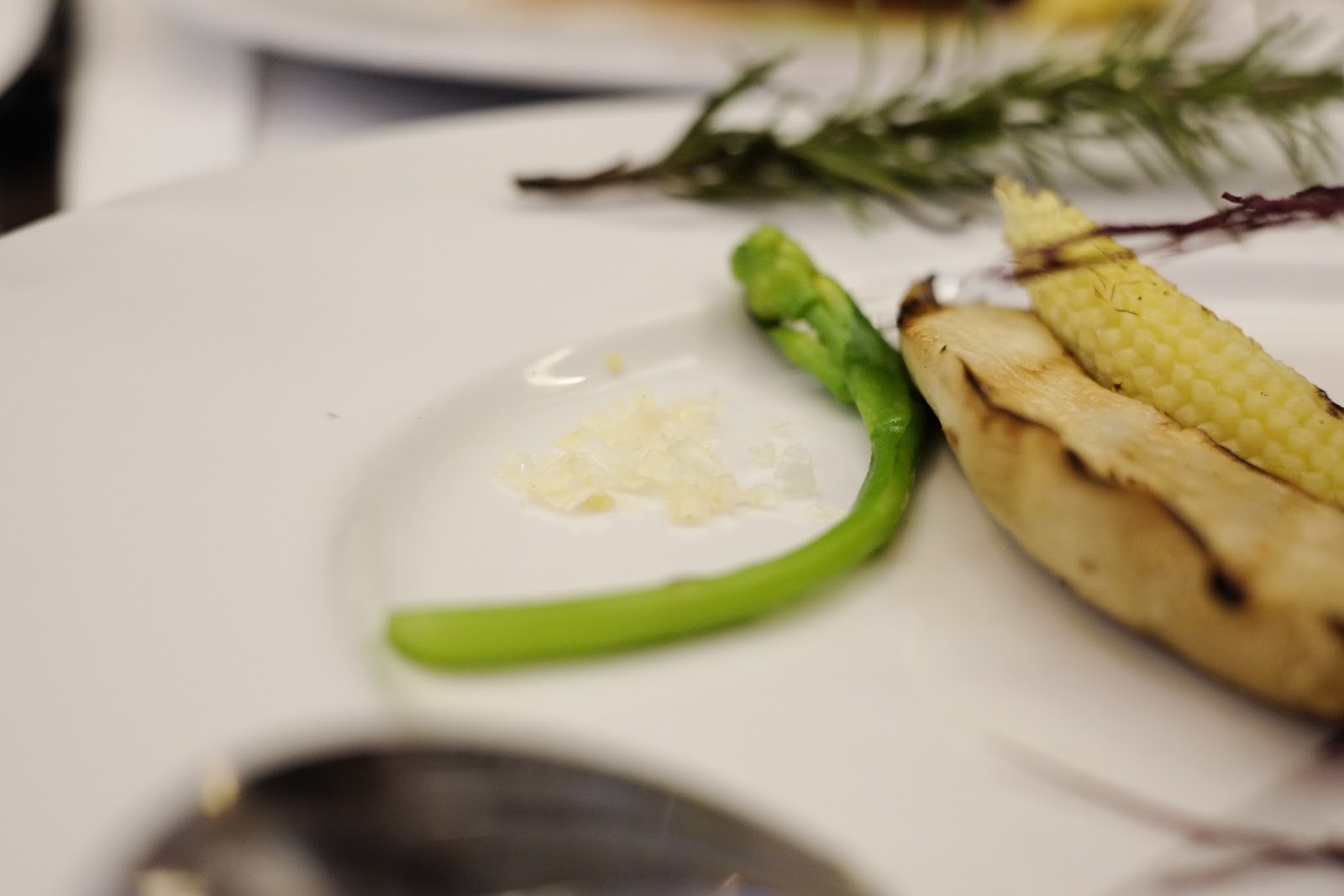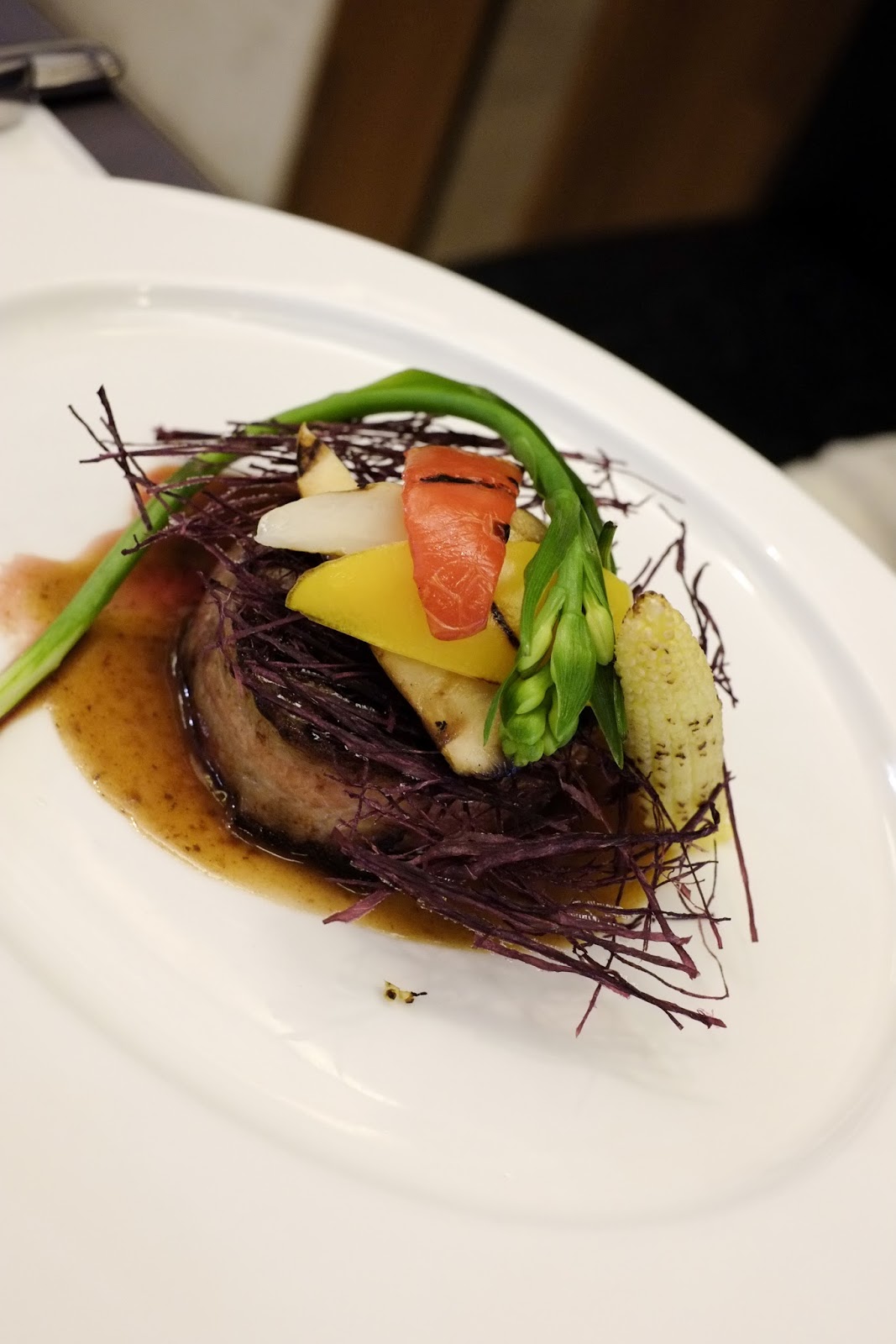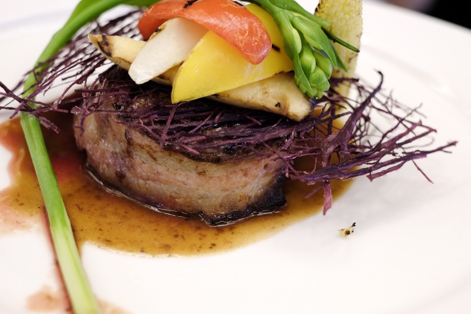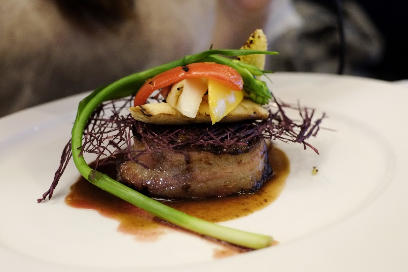 主餐鵝肝菲力七分熟,充滿視覺效果,配菜有玉米,杏鮑菇、甜椒跟很特別的白玉筍,還包著炸地瓜,牛排外則又包著一圈培根,有吃一小塊,味道挺不錯,如果五分熟配上鵝肝應該會更美味,但沒吃到培根。七分熟由圖來看就知道,少了五分那種帶點粉嫩的顏色。唯一可惜就是玉米筍有點焦了