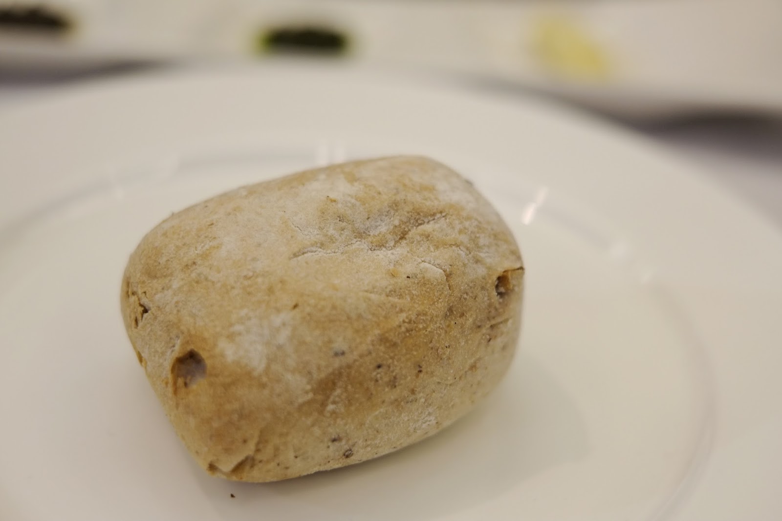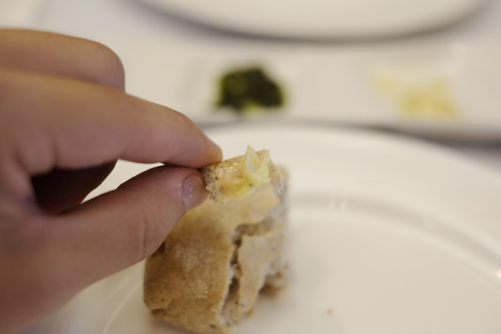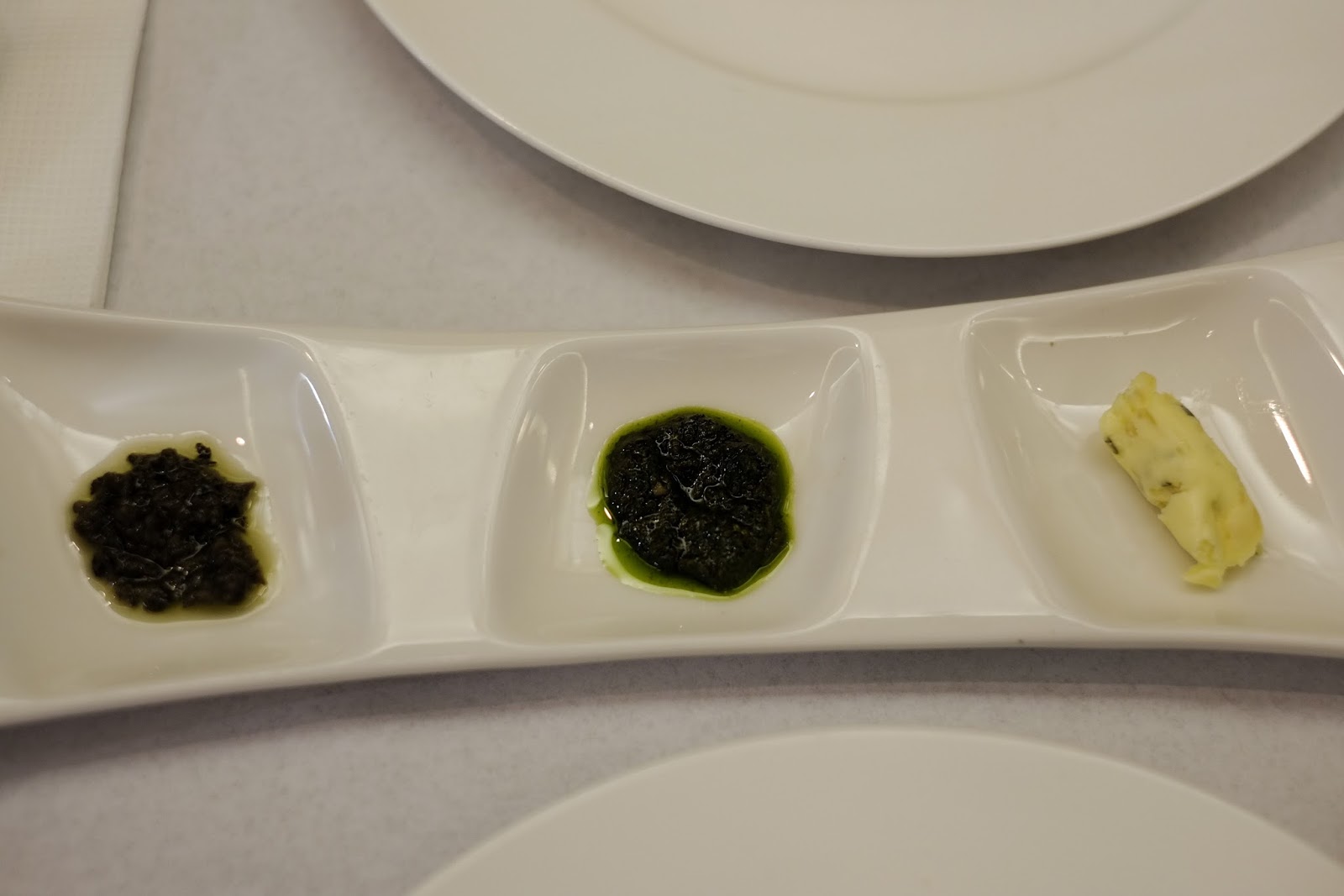 一開始送上餐前麵包,附上三種沾醬,是全麥麵包裹核桃,熱呼呼吃起來鬆軟好咀嚼,沾醬分別是香蒜奶油醬、鯷魚醬、青醬。不論單吃或是個別沾醬都很不錯,青醬還蠻特別帶點淡淡的羅勒味道,香蒜奶油個人比較喜歡,如果調個蜂蜜奶油好像也是挺不賴,這樣剛好可以有鹹有甜一次滿足。
