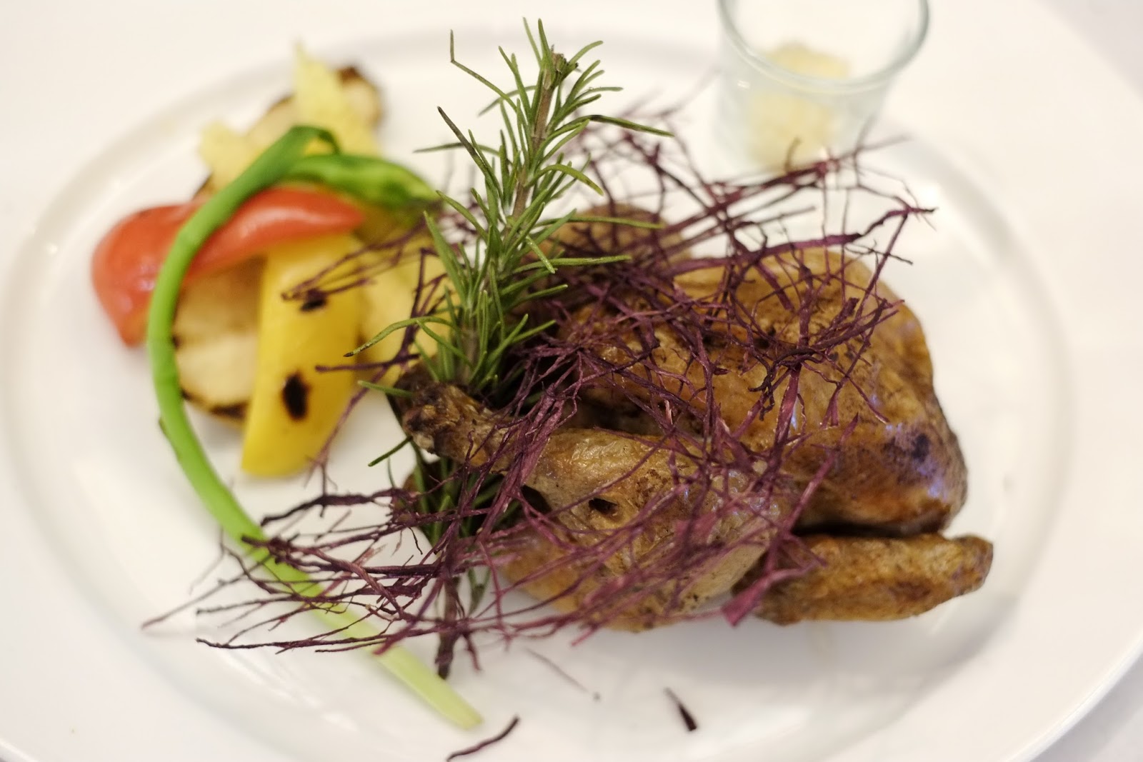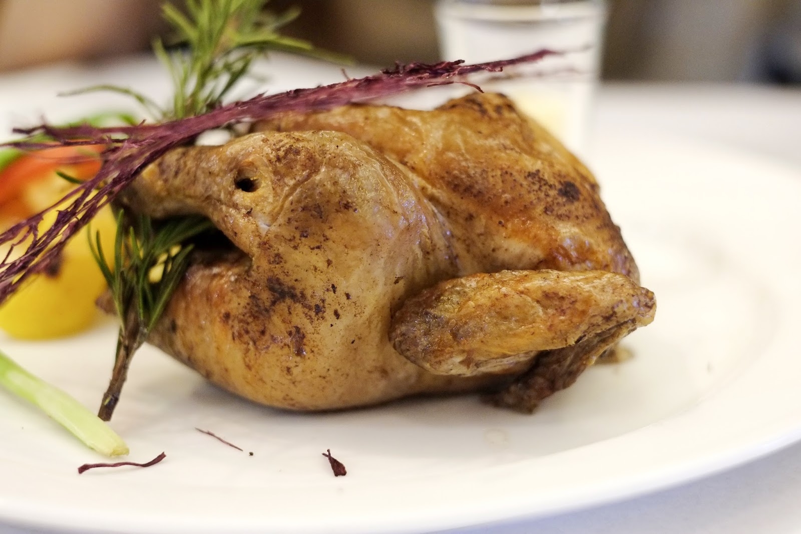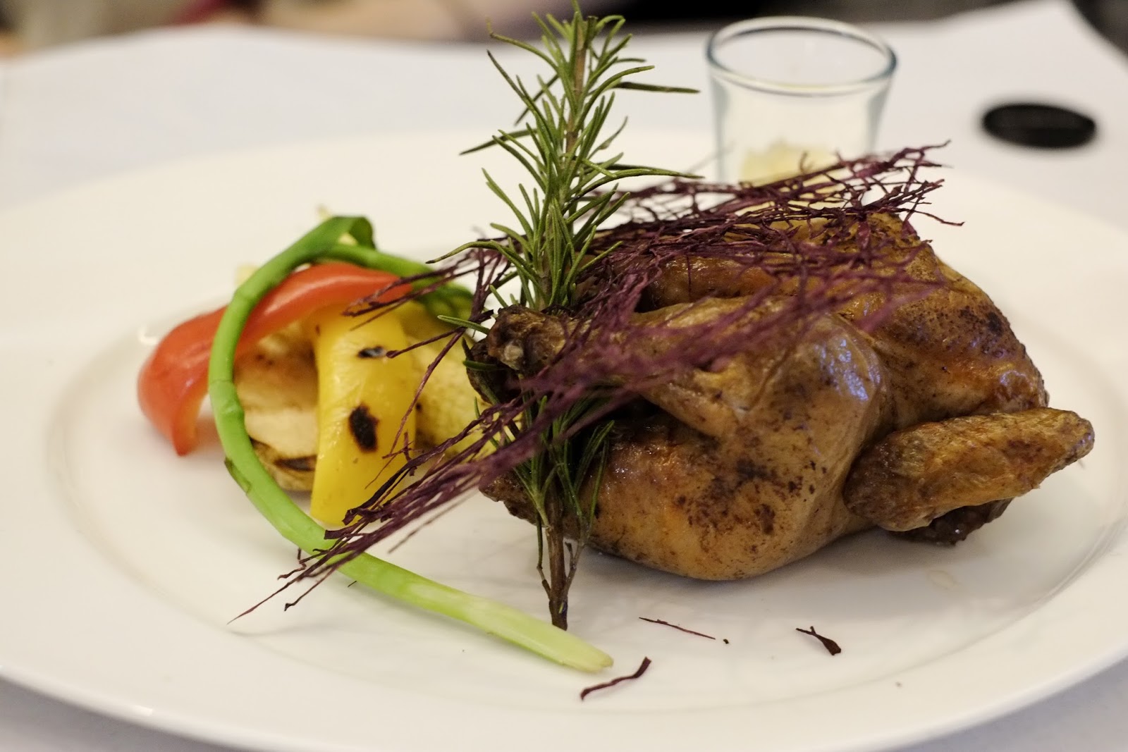 接下來送上來的爐烤春雞,一整隻烤雞端上桌了!當我傳照片時,下面出現了大家畫錯重點的文字,我要表達是一整隻烤雞…