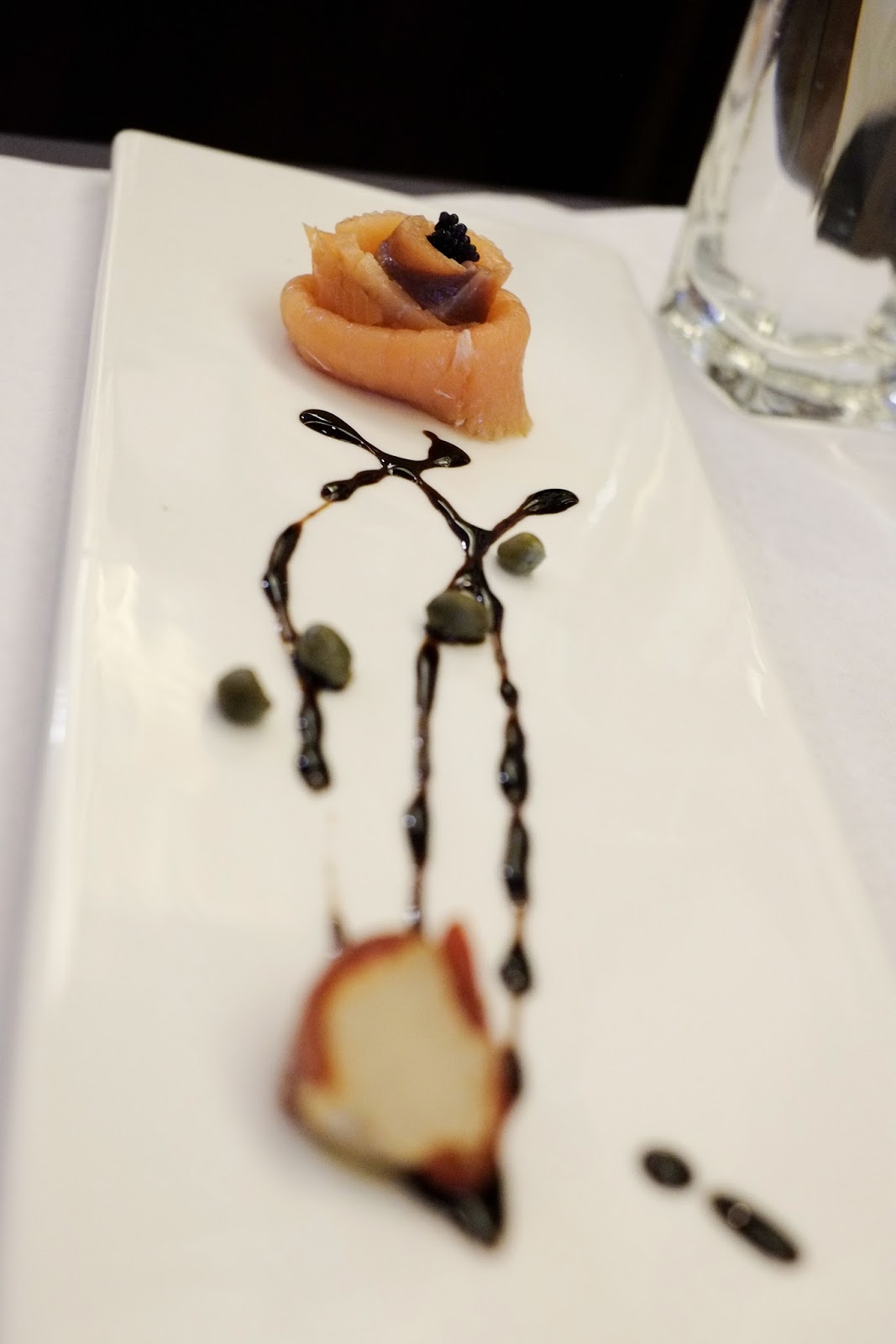 前菜煙燻鮭魚起司,很COLORFUL的一道餐點,分別是燻鮭魚上面還有一些魚子,醋跟酸豆,最右邊擺的是田椒起司,建議是從左到右吃,酸豆單吃真的酸到會哭,但是加上鮭魚的口感相得益彰,甜椒起司,因為鮭魚被我吃完了,直接單吃,味道很濃,就算有甜椒入口還是蓋不過起司味道,有點好奇搭鮭魚吃的口感。