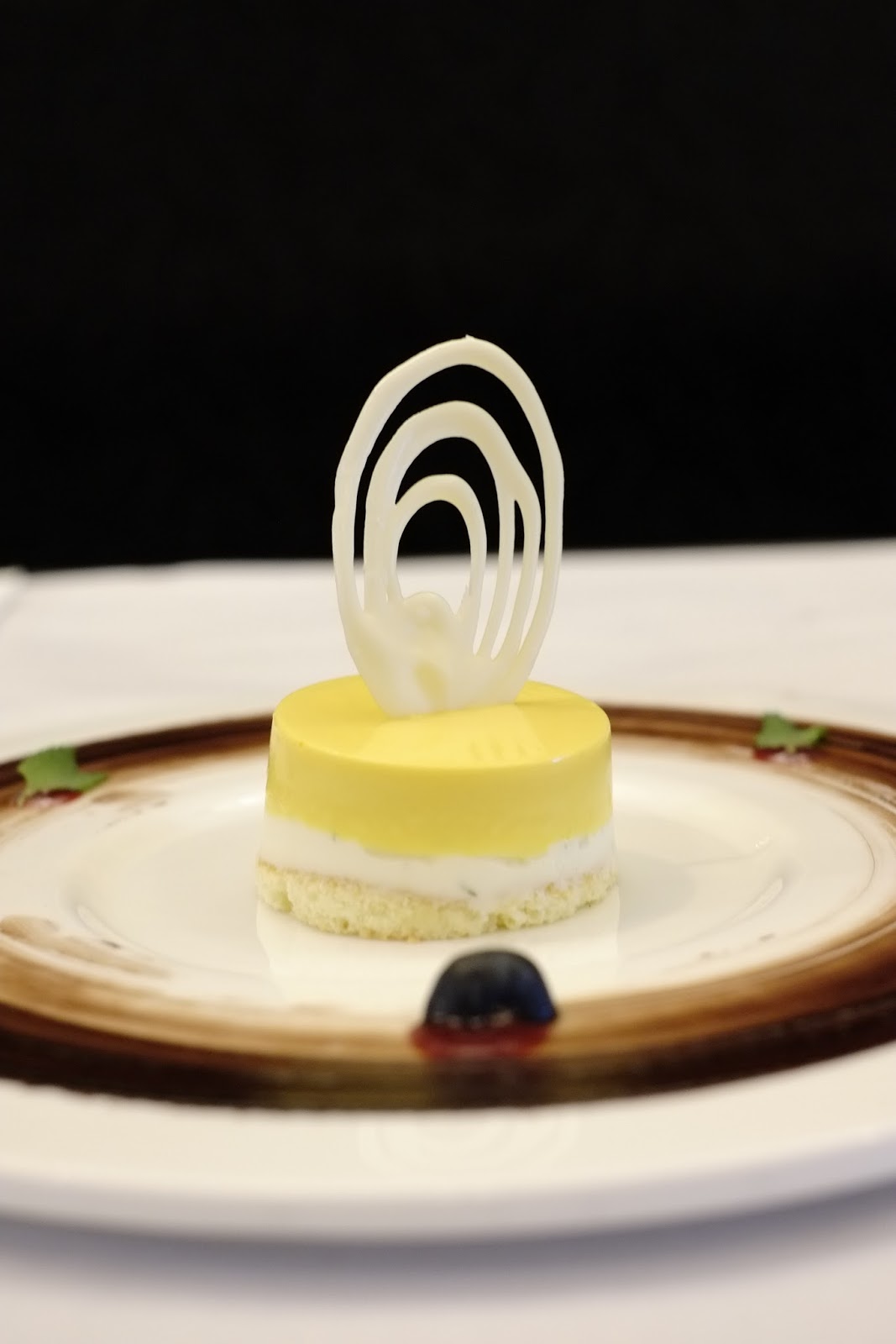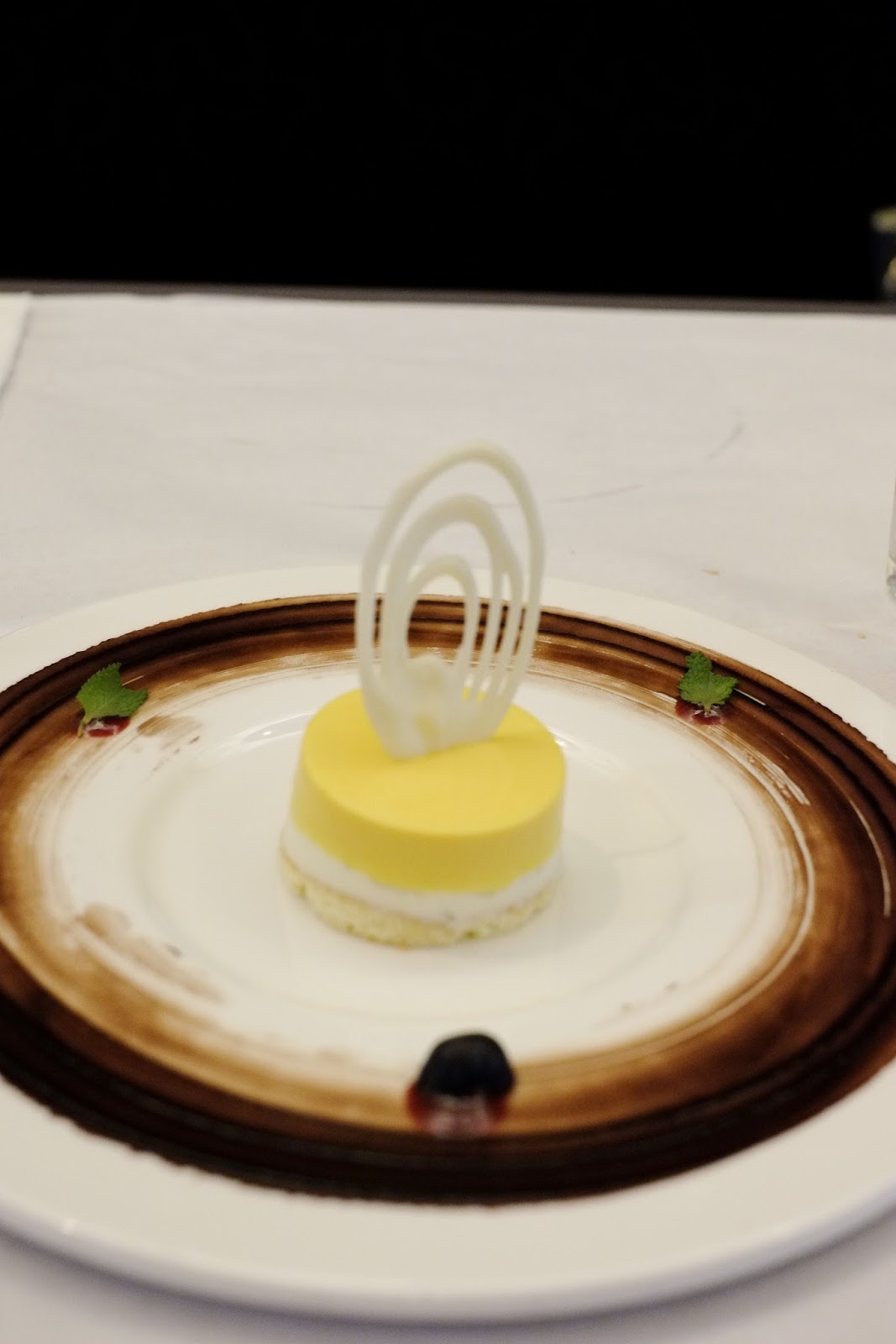 芒果夏洛特,芒果餡加上慕斯跟蛋糕體,外面用巧克力轉成一圈,是可以摳下來吃的。味道爽口不甜膩,芒果果然是夏天的水果。上面的白巧克力純看個人偏好,蛋糕體是略硬一些,介於派皮跟蛋糕中間。最後我是沒舔盤子啦…