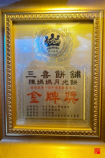 店家在櫃檯旁邊,也陳設了曾經獲得的殊榮與獎項,可以看到一面建國一百年國家優良商品的金牌獎,以及老闆娘與蔡英文總統及現任監察院長陳菊的合照。