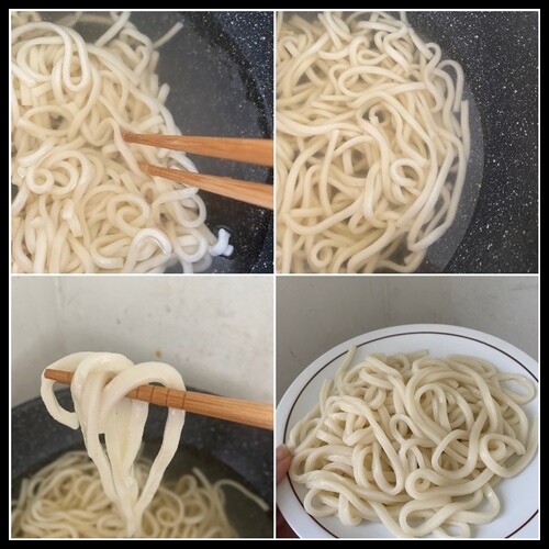 2.可依個人對麵條軟硬的喜好增減時間,將麵條撈起把水瀝乾