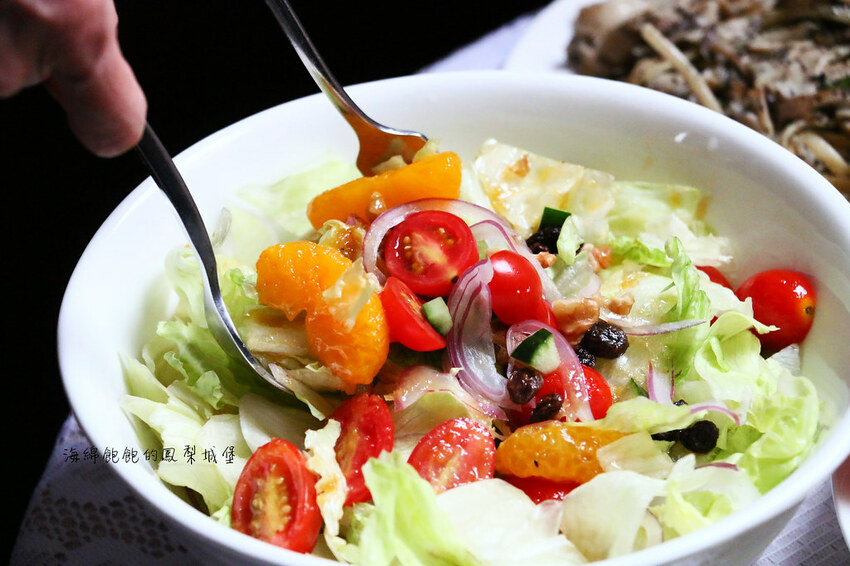 主廚沙拉以生菜鋪底,配上小番茄跟橘瓣