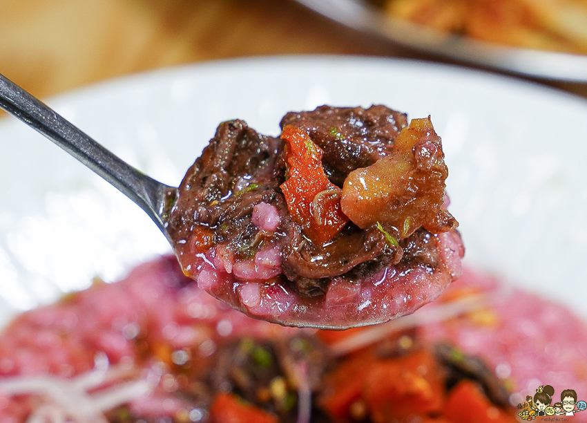 獨門特製的紅寶石燉飯,使用新鮮甜菜根打成果泥烹飪熬煮