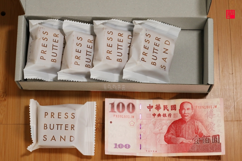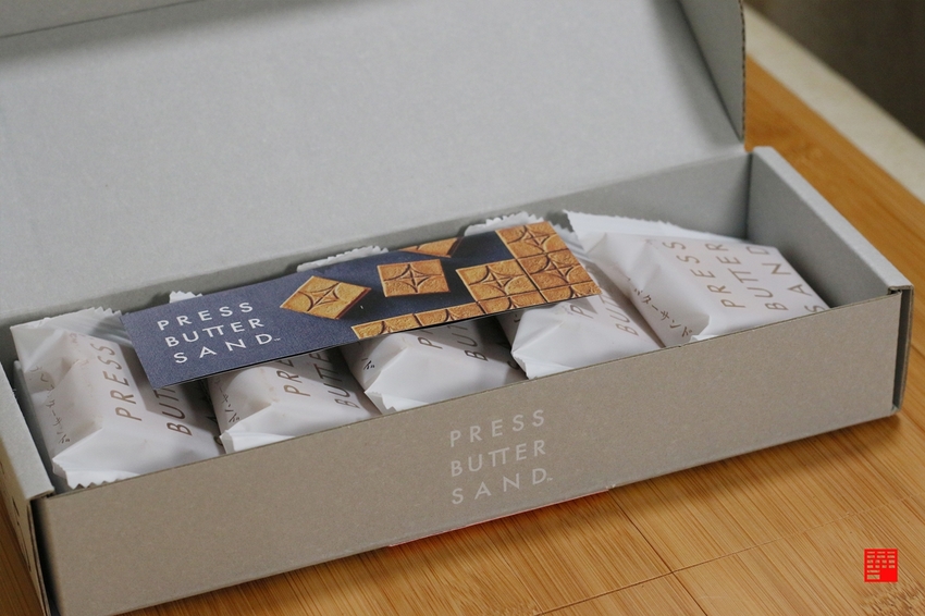 先來看看外觀,「PRESS BUTTER SAND」的袋子設計就非常有質感,外盒的LOGO符號其實看不太懂是什麼意思,下方的橘色是膠帶,我要拆開的時候還小心翼翼地拿美工刀,生怕把這款要開箱的美食給破壞了(笑)。