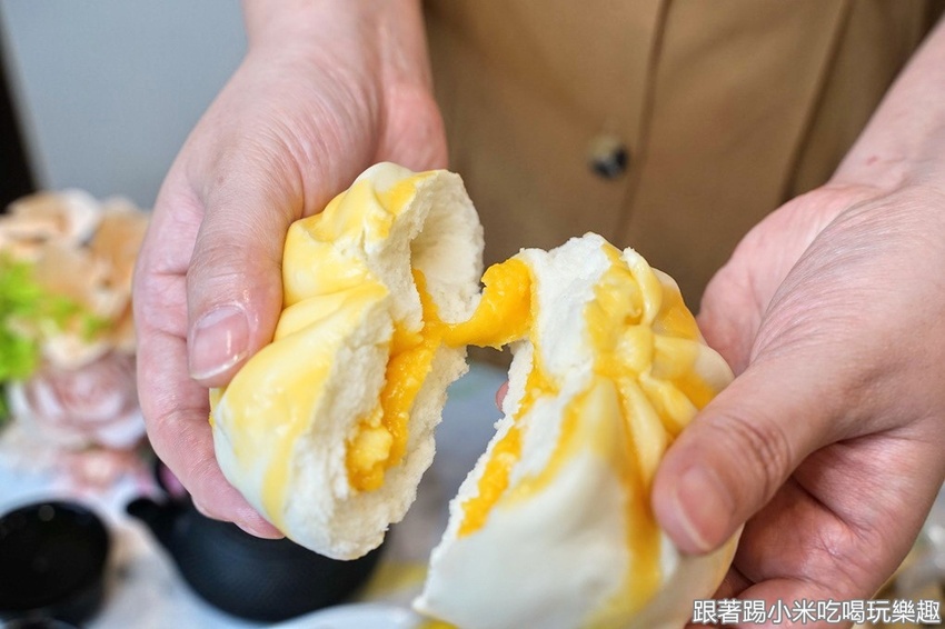 撕開包子可以看到有黃黃的雙色奶皇內餡,是相當誘人的視覺感受