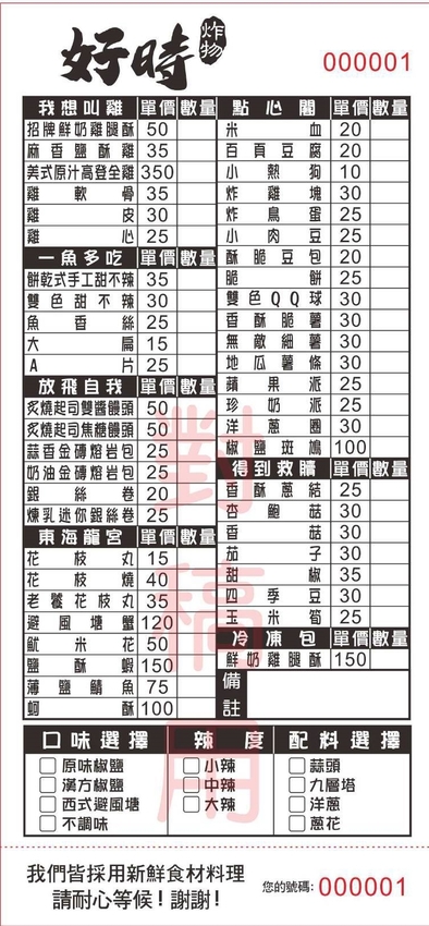 好時炸物不但炸物和許多鹹酥雞店不太一樣,連擺設也不同,不像大部分的鹹酥雞店將切好的食品擺設在平台上,讓大家點餐,主要是為了保持食物品質及新鮮之,因此僅以菜單提供大家選擇~