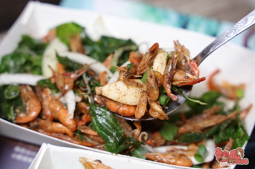 較小的蝦子是溪蝦,你看看這表面炸到酥透的模樣,幾乎可見微微蝦殼,直接拿湯匙挖著吃最爽,咀嚼在嘴裡滿滿蝦味,鹽酥的口感就是讓人吃不膩~即便是小朋友都說好吃!