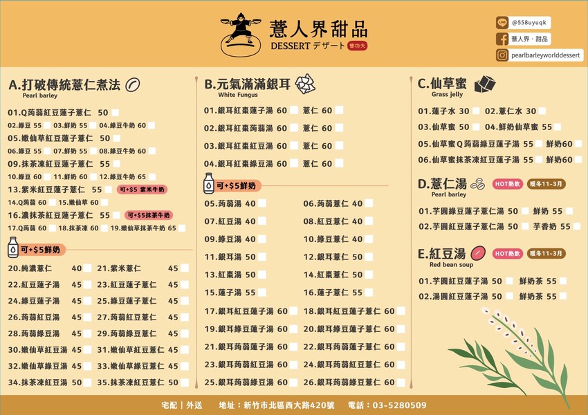 新竹西大路上新開幕「薏人界 • 甜品」,有著復古裝潢的店面,沒想到是一間以薏仁為主的甜品專賣店!遵循日式、台式的烹調工法,堅持每日純手工熬煮,清甜不濃稠的口感,打破你對薏仁甜品的既有印象,低糖度的配方,不管男女老少都很適合。「薏人界 • 甜品」主打蓮子薏仁、銀耳甜湯、仙草蜜以及冬天限定的熱薏仁湯、紅豆湯等等系列,配料部分還可搭配紅豆、綠豆、嫩仙草、蒟蒻、抹茶凍等等選擇,還能再升級鮮奶、抹茶牛奶及紫米牛奶,多樣選擇性及客製化,真的很貼心。每一杯都是真材實料,拿來當正餐、下午茶都很可以,在這注重養身的年代,「薏人界 • 甜品」絕對是你健康的新選擇。p.s前一天買回家當隔日早餐、晚餐也很可以,記得冷藏保鮮即可!