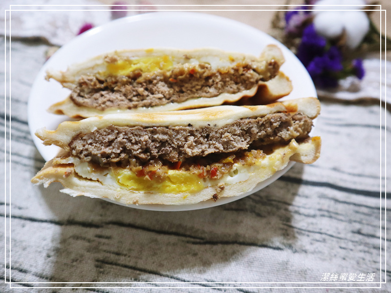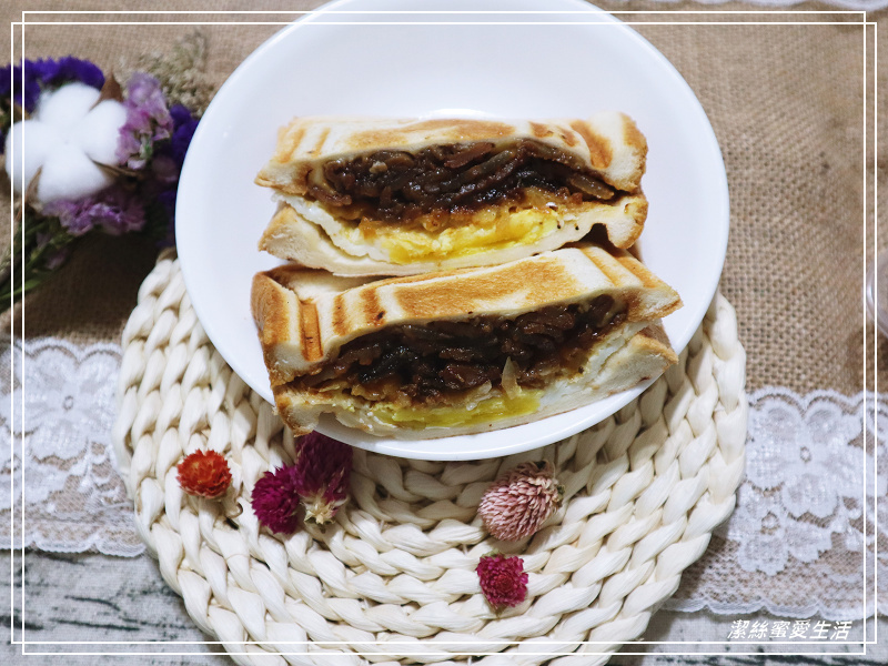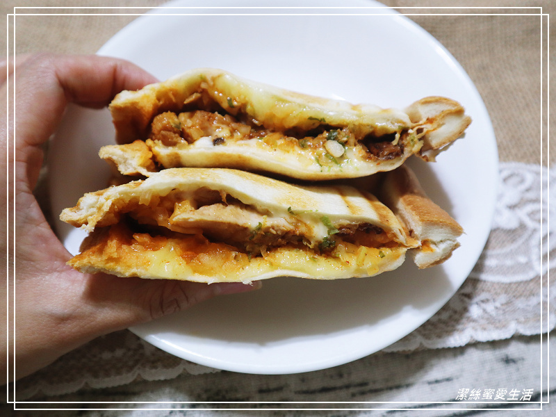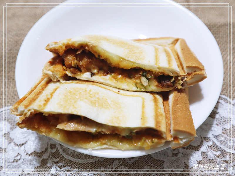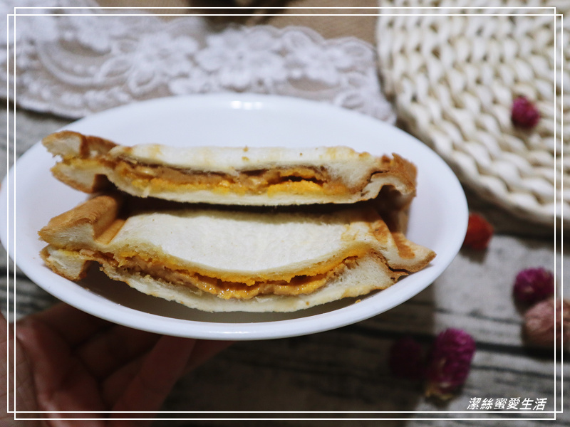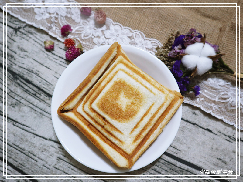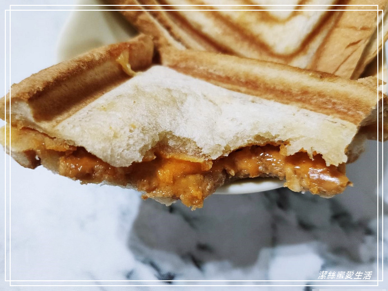 還沒切開時長這樣,熱壓過的吐司外層香酥,特別是邊邊的部份——應該蠻多人不愛吃的厚邊邊,在熱壓過後其實反而更好吃呢XD。