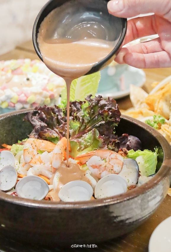 少見以梅子系為主的綜合海鮮沙拉,新鮮海味一吃就知道,爽脆的生鮮蔬菜加上整尾蝦子、Q彈中卷、飽滿蛤蜊,淋上特製梅子醬的酸甜滋味,還吃的到梅子肉,爽口又開胃!