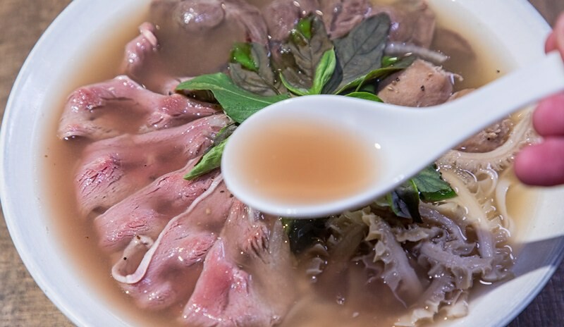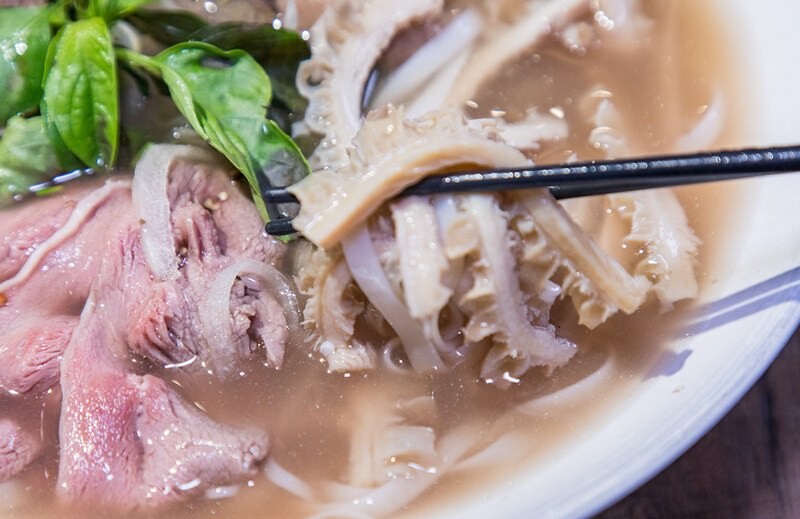 河粉是薄扁型的,但在我拍完後才吃,也沒因此過於軟爛,吃起來有一點條厚實很多的米線,咀嚼端和湯頭的鮮美極之合拍,搭點九層塔一起入口更棒。就不知這品質不錯的九層塔是不是可以加點(笑)。